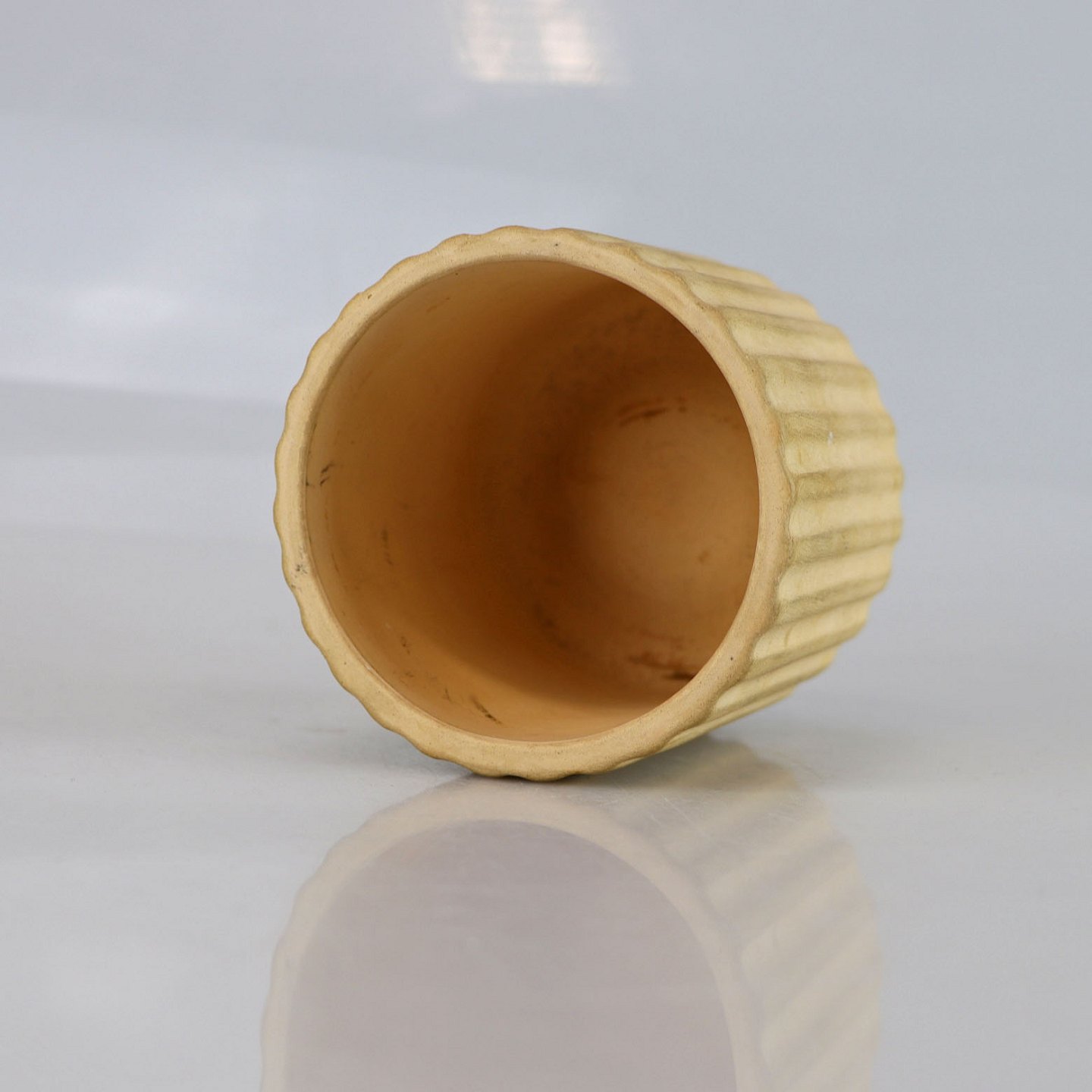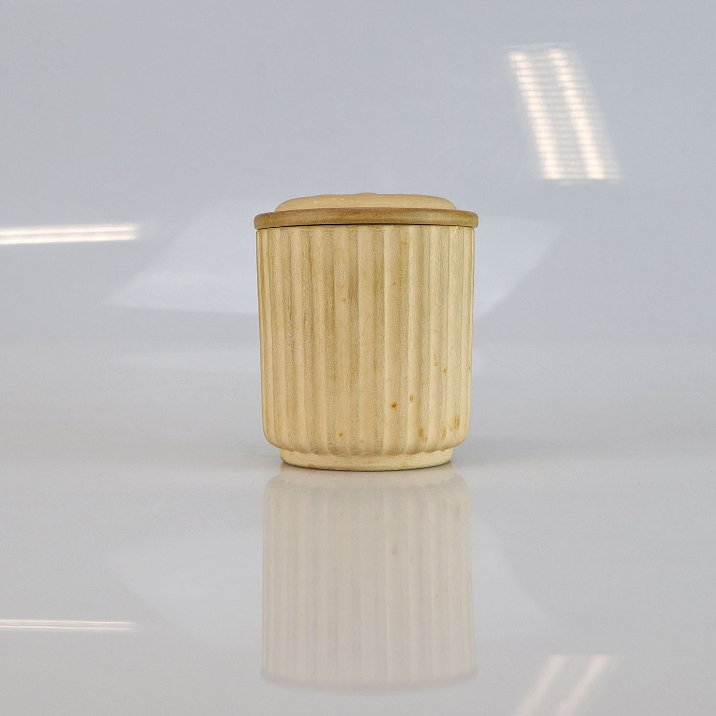 Krukke med låg i uglaseret keramik. På låget ses et hestemotiv
