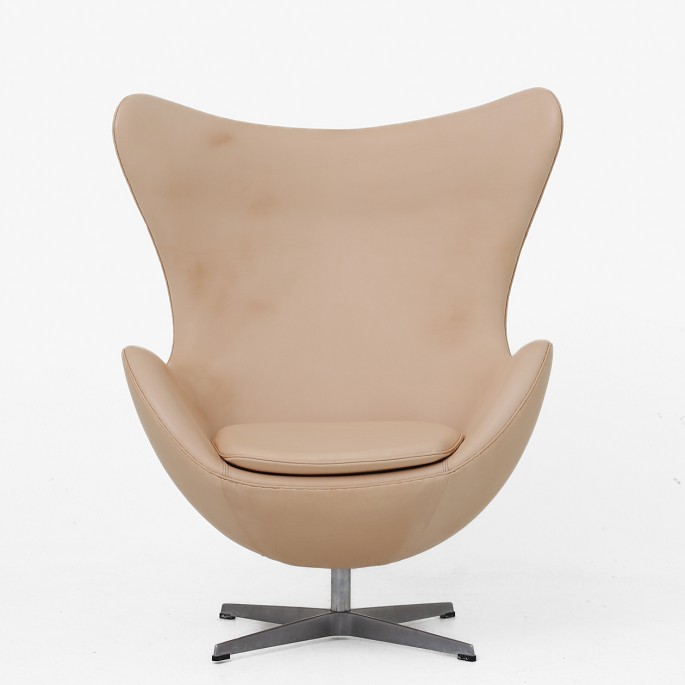 AJ 3316 - Nybetrukket 'Ægget'-lænestol i naturlæder/vegetallæder med ny fod af aluminium. KLASSIK tilbyder stolen i læder efter eget valg. Kontakt os venligst for mere information.