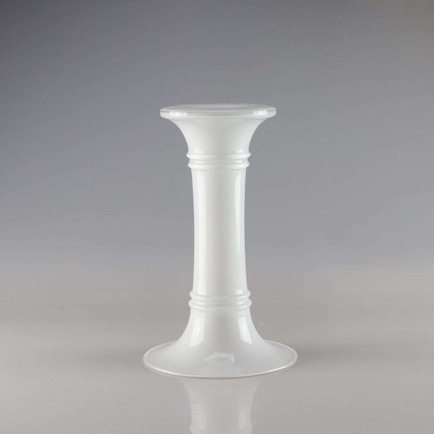 Vendbar lysestage i hvidt glas, så den også kan bruges som en vase
