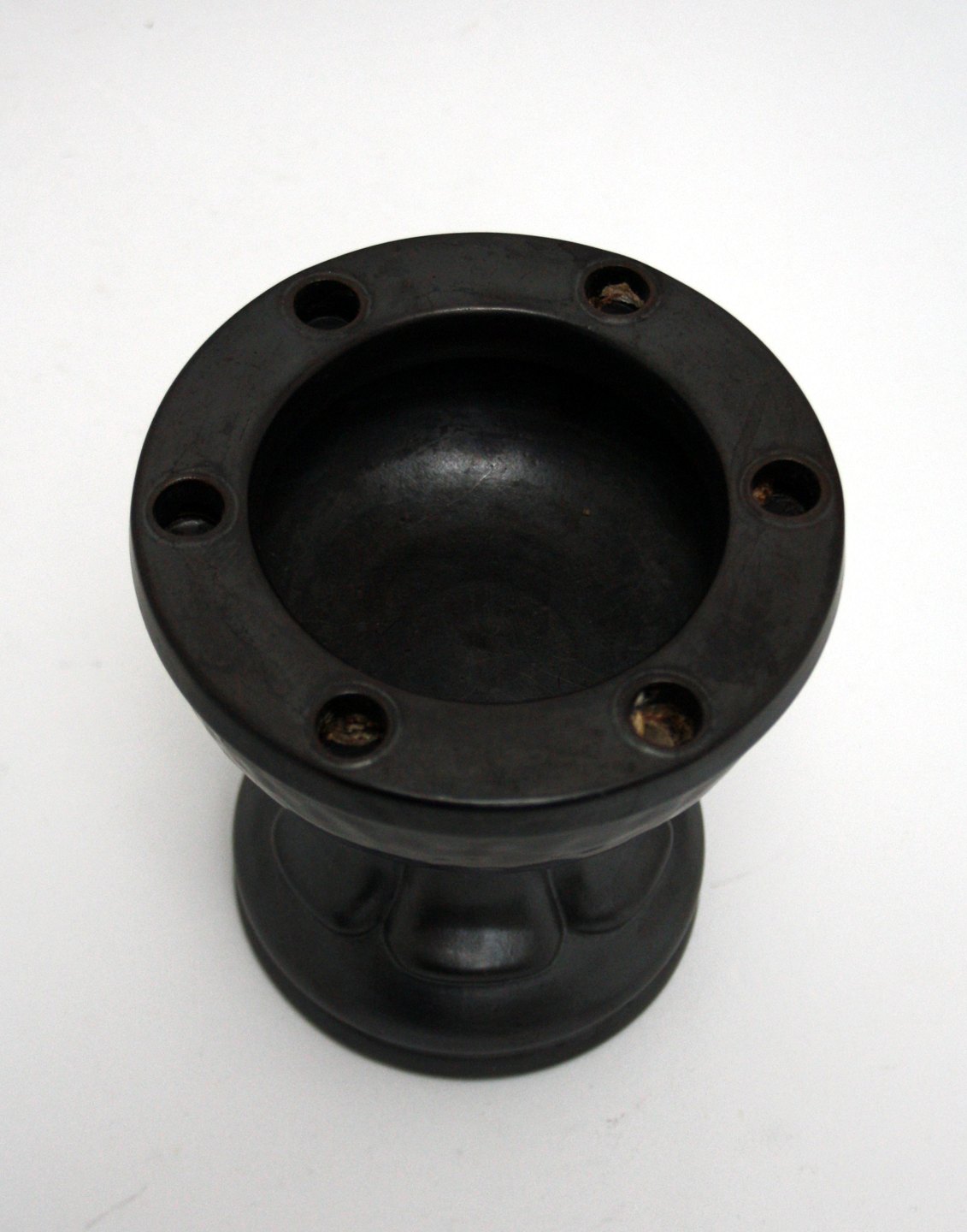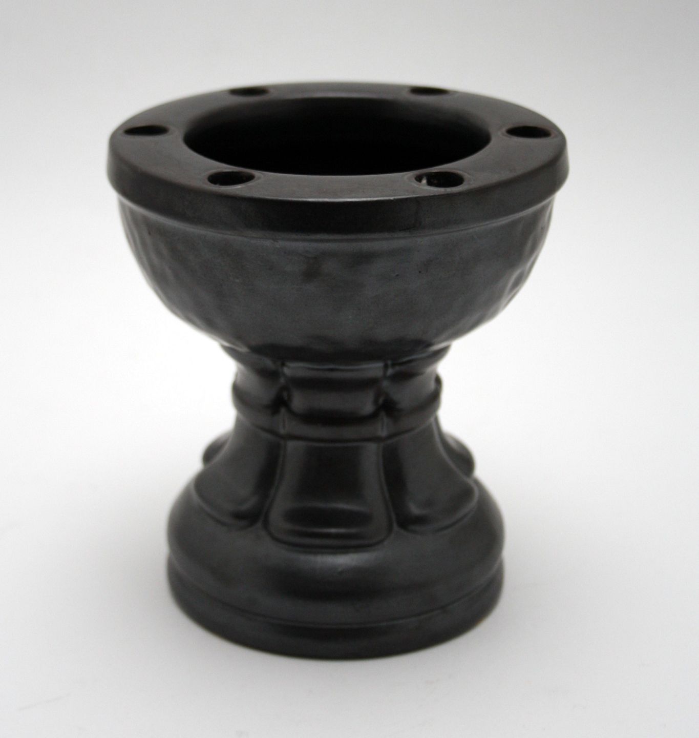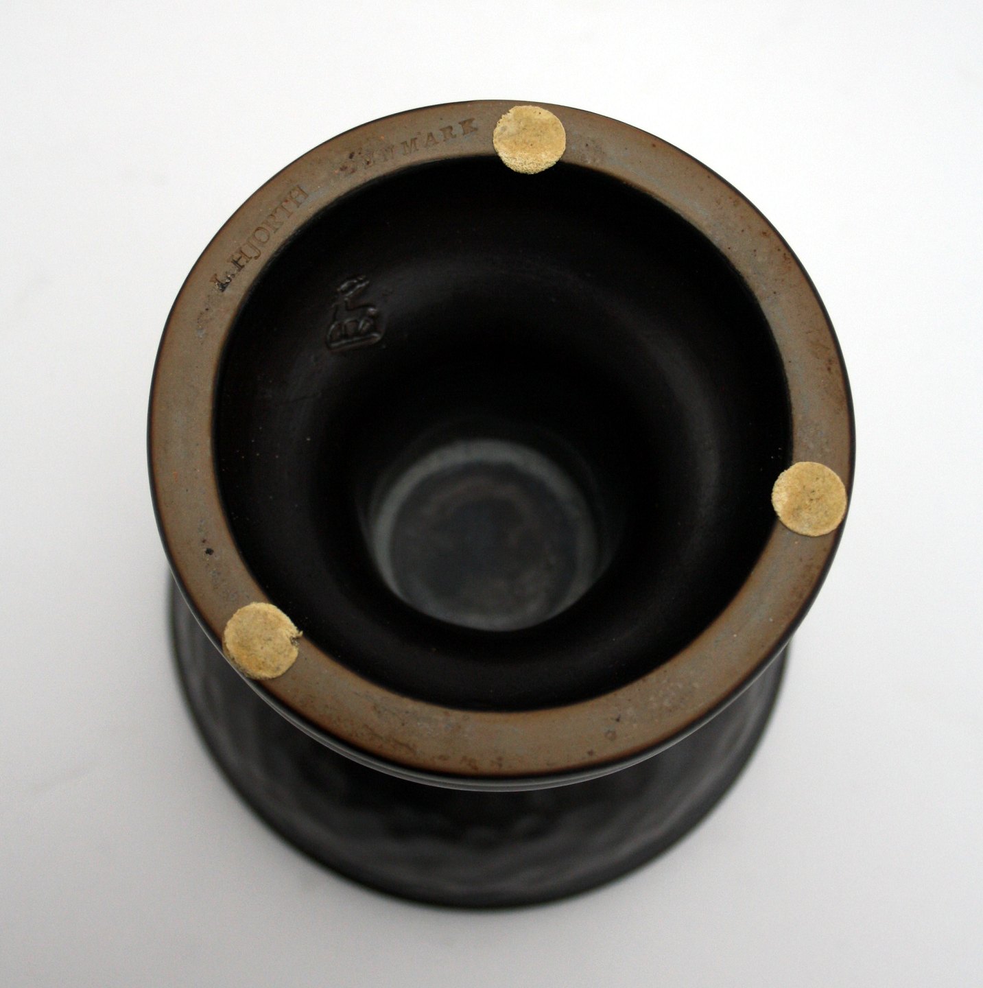 L. Hjort, Bornholm. Lysestage opsats til julelys, form som døbefont, brun glasur. Højde 13 cm. Diameter 12,5 cm. Fin stand. Pris: 375 kr.