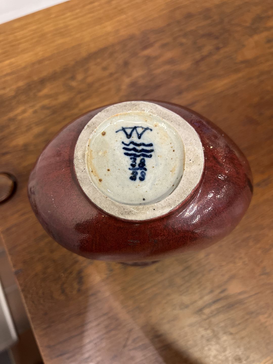 Bode Willumsen vase i stentøj glaseret med okseblods glasur. Udført hos Den Kgl. Porcelænsfabrik ca. 1930'erne. Pæn stand. Sign. med monogam.