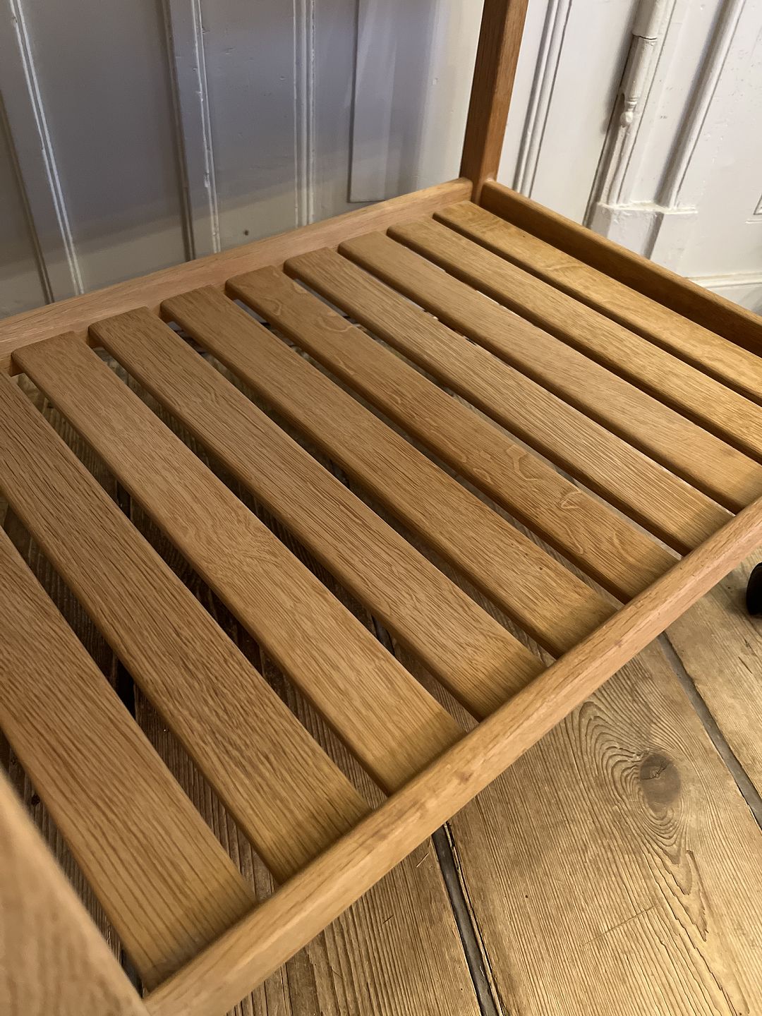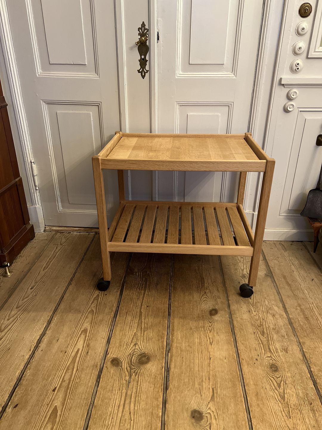 Text zugänglich auf Dänische: Kurt Østervig rullebord i egetræ med plastic hjul.
