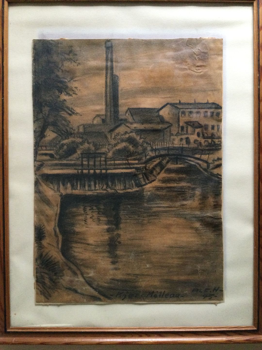 Kultegning af Alf Hansen 1945 - Parti fra Kjær Mølleå med Kjærs Mølle.