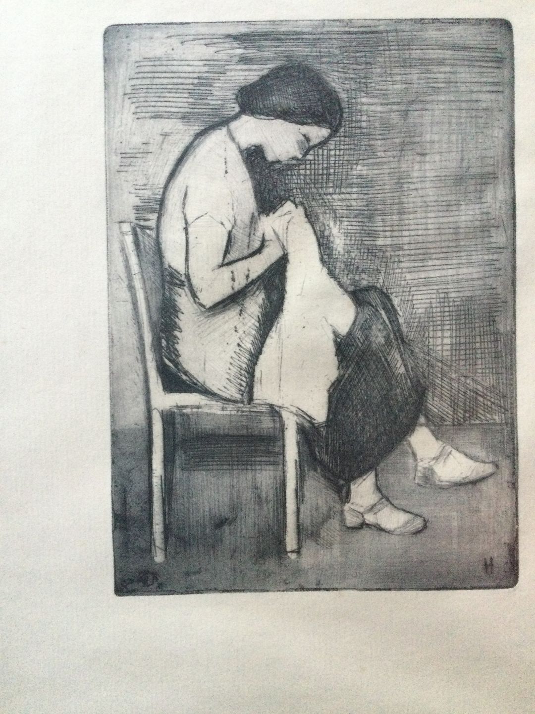 Radering af Herman Stilling - Ung kvinde med håndarbejde 1956.