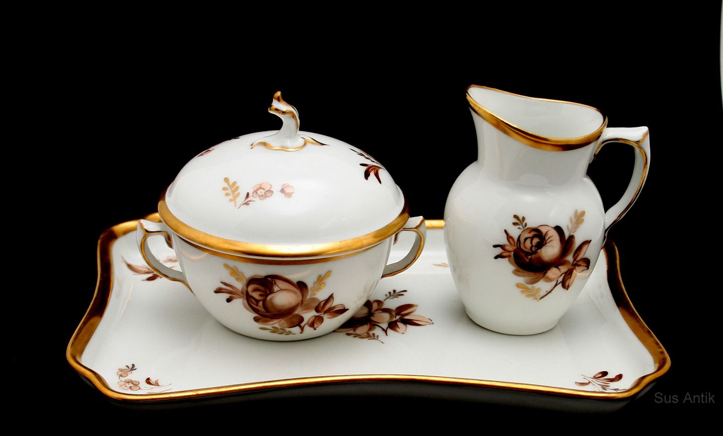 Royal Copenhagen, Brun Rose, Sukker og fløde sæt med bakke.