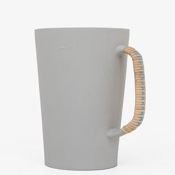 Håndlavet kande i stentøj med grå glasur og flettet hank med blå stribe. Serien 'VAND'.