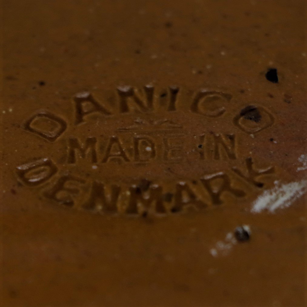 Keramik planteskjuler i blå og grønne farver på brun baggrund.