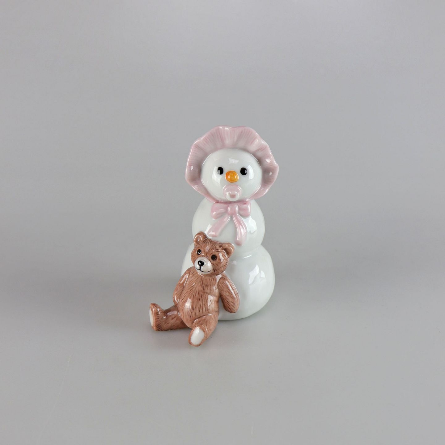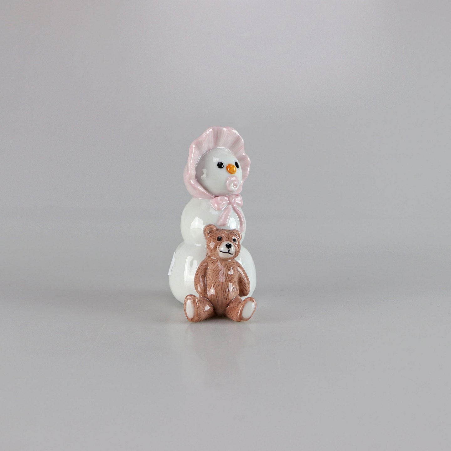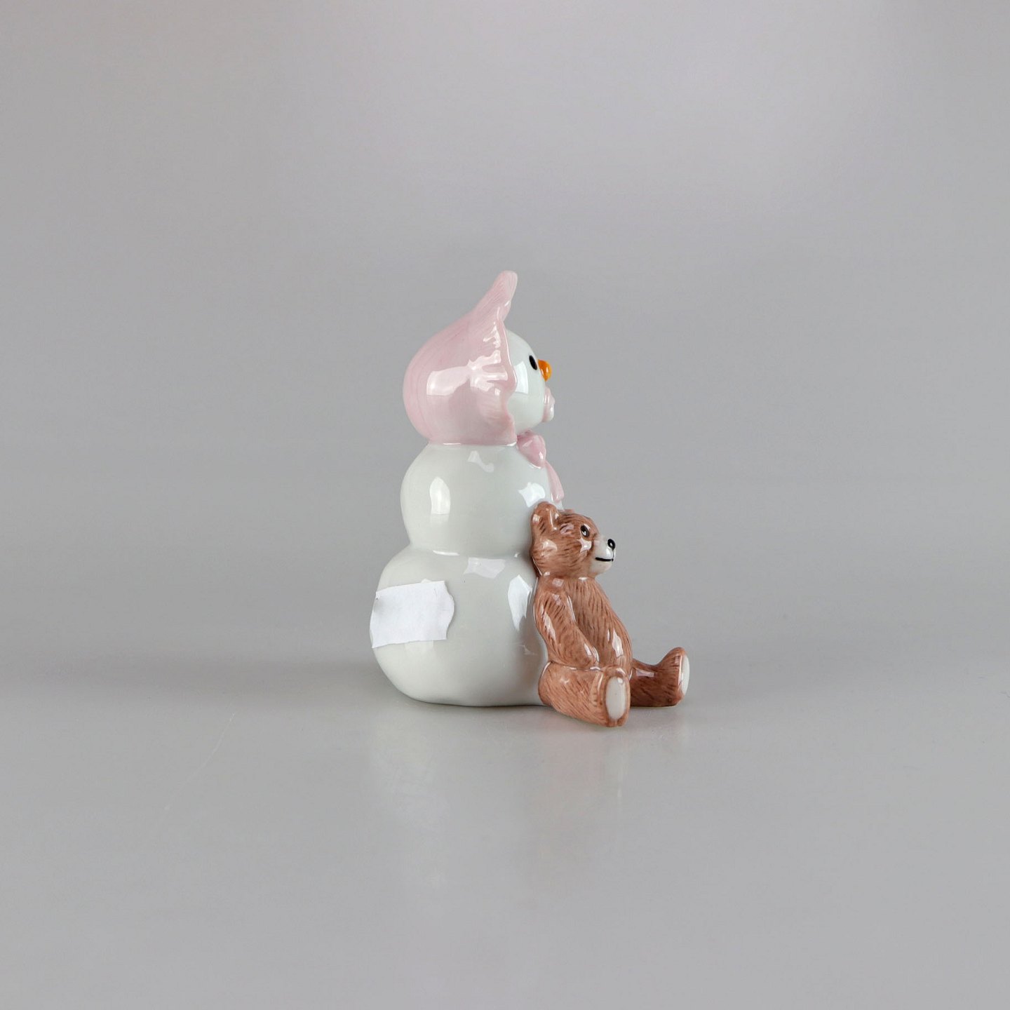 Kongelig porcelænsfigur af snemandspige med lyserød kyse og brun bamse