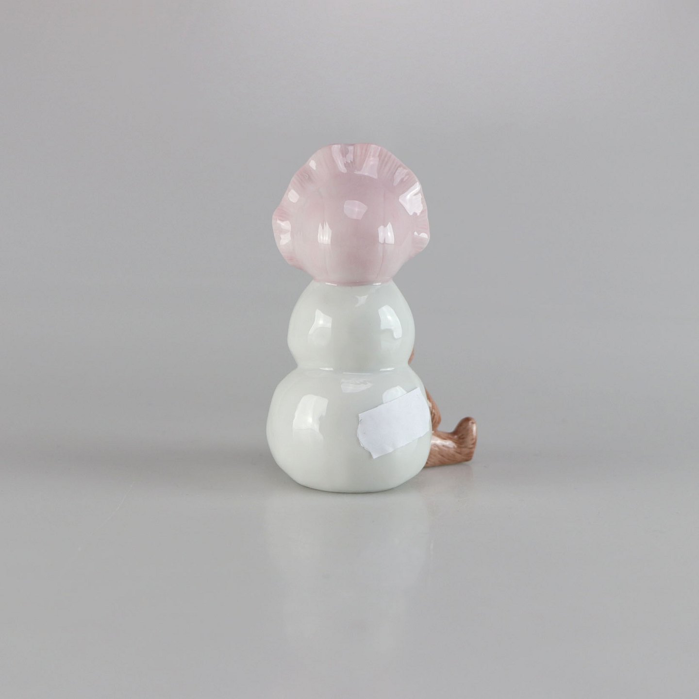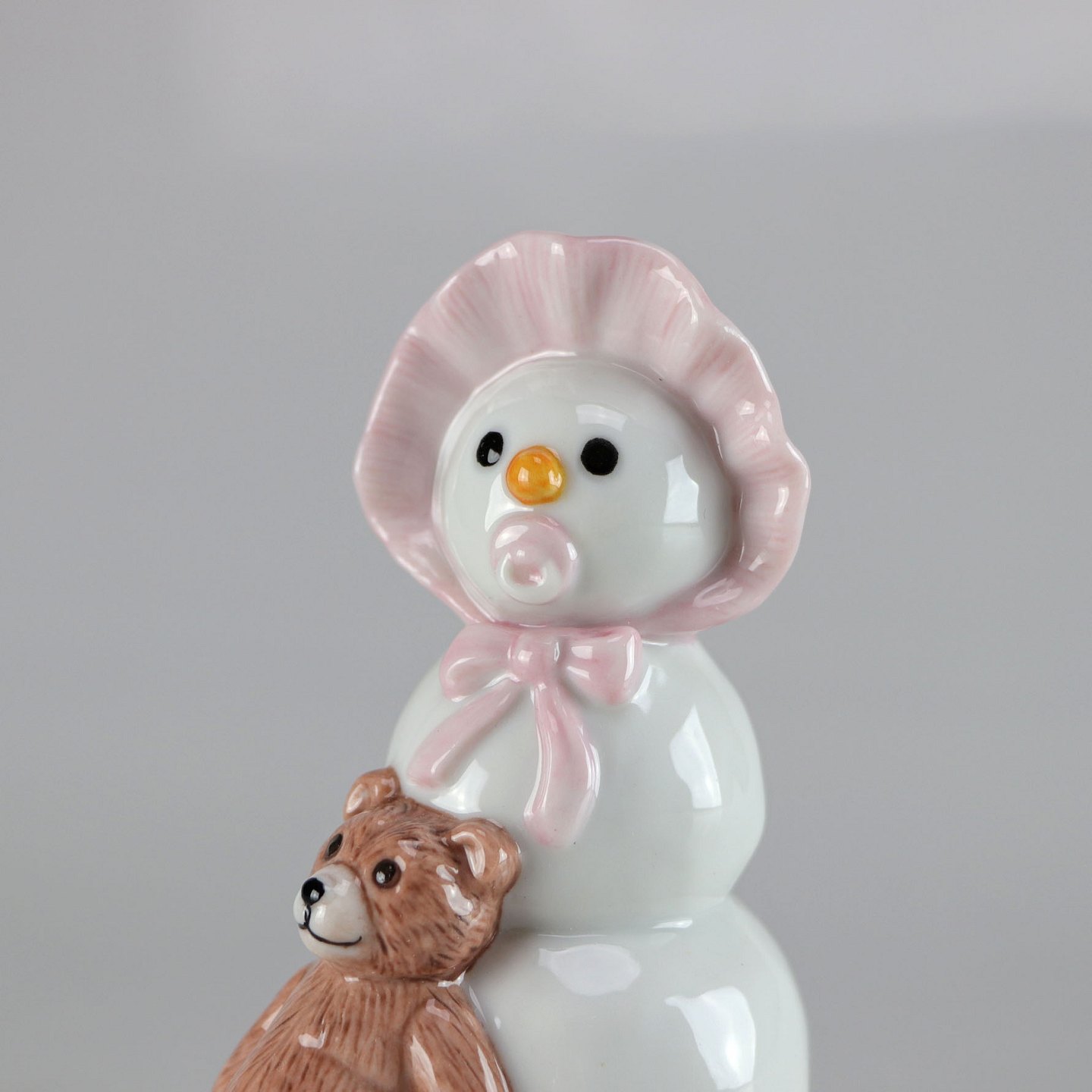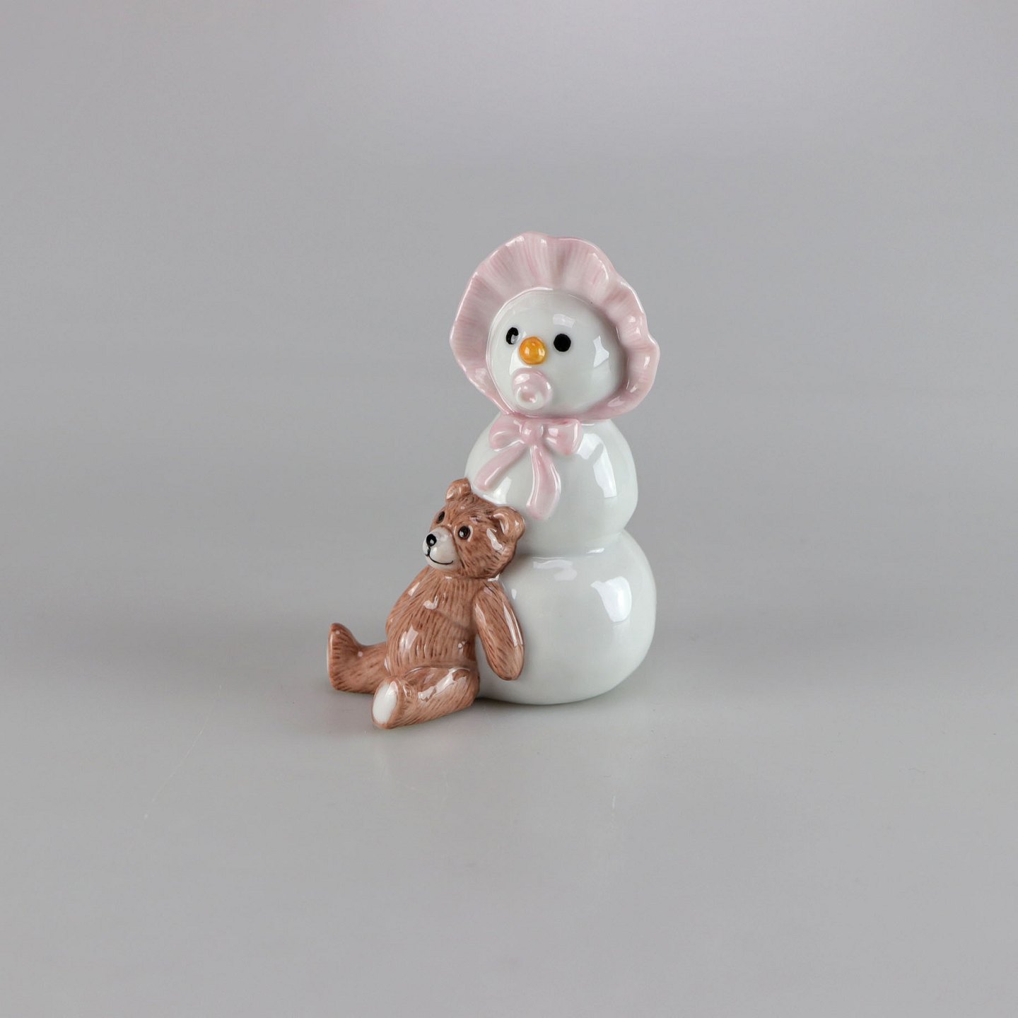 Kongelig porcelænsfigur af snemandspige med lyserød kyse og brun bamse