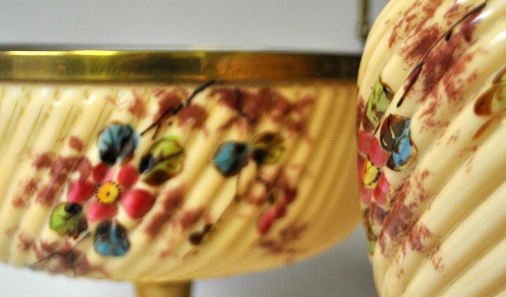 German strawberry set, consisting of bowl on foot and jug, approx. 1900. Foot and handle in brass - previously silver-plated. Bowl and jug in white opaline glass with cream overpainting and enamel painting of flowers and insects. Bowl height: 17.5 cm. Dia.: 18.5 cm. Jug, height: 28 cm.