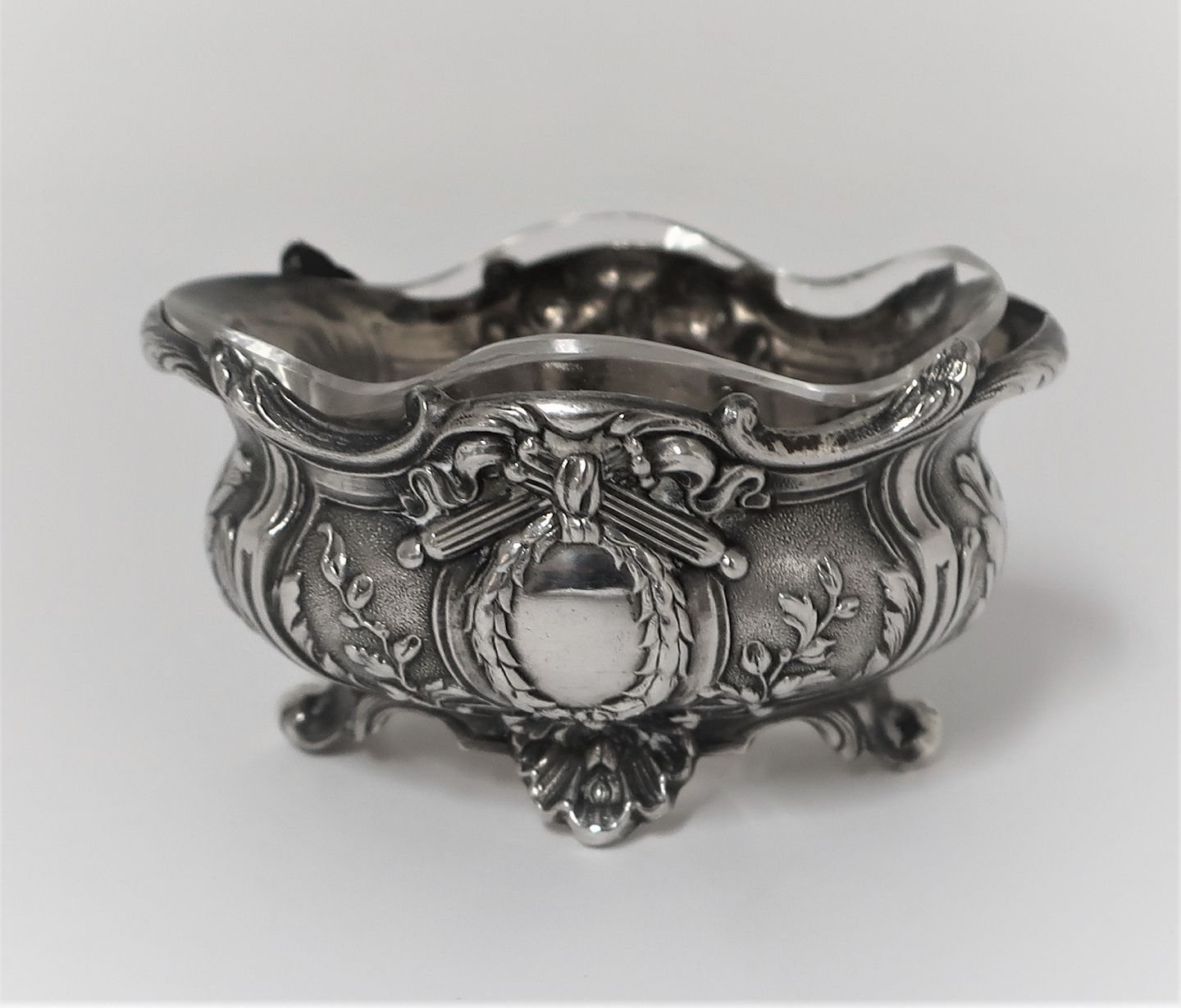 Spanien. Sølv (915) saltkar med glas indsats. Længde 6 cm.