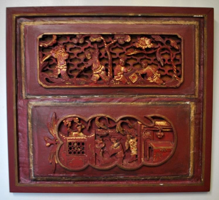 Par antikke kinesiske udskårne paneler i træ, 19. årh. Med forgyldning. Opsat på en plade. 42 x 46 cm.