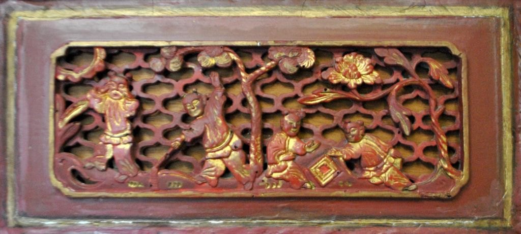Pair of antique Chinese carved wooden panels, 19th century, with gilt. Mounted on a plate. 42 x 46 cm.