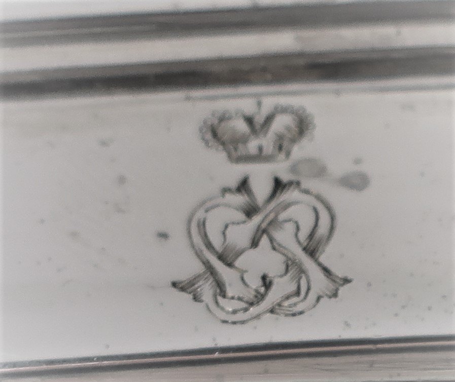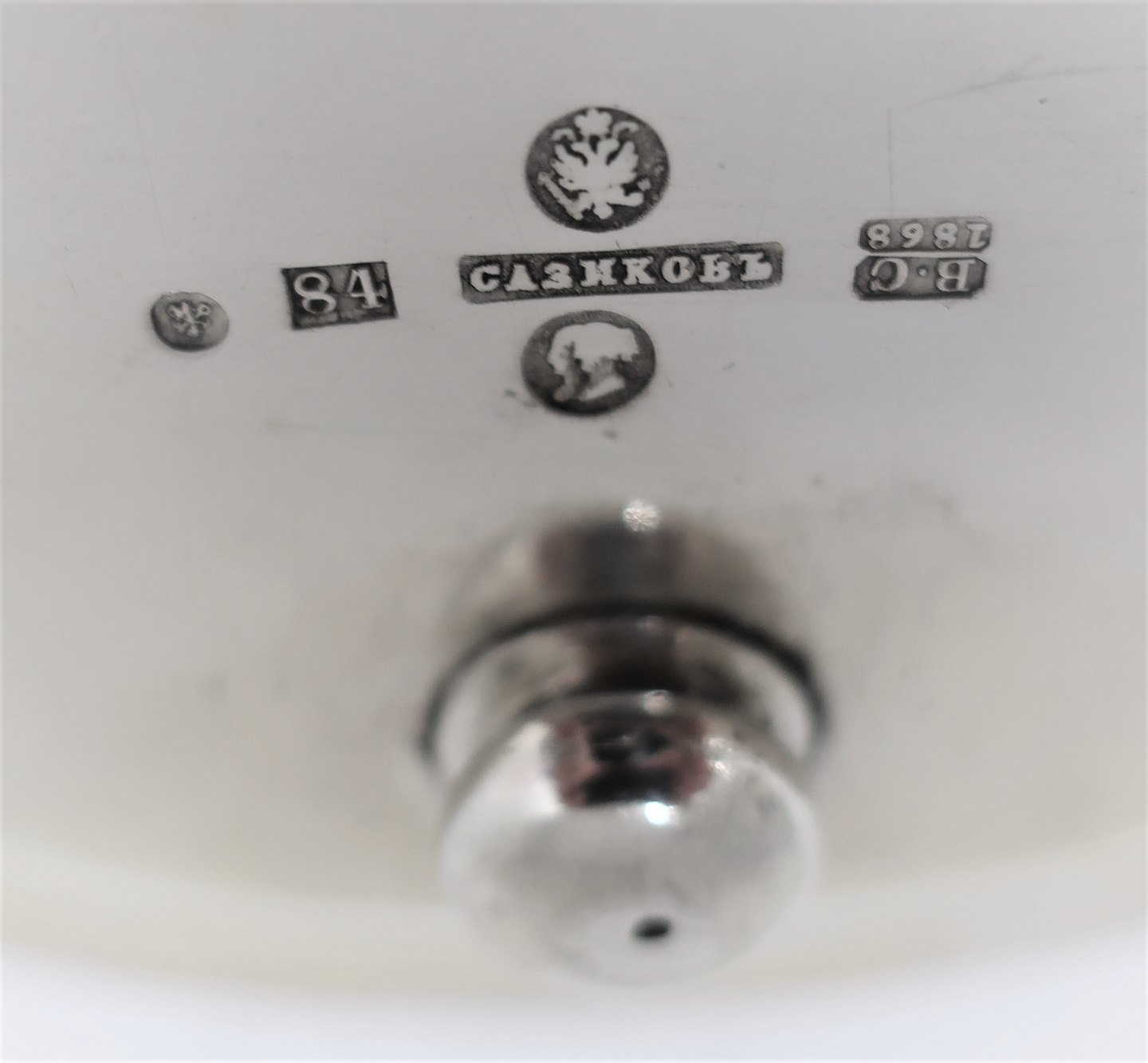 Sasikov. Russland. Sankt Petersburg. Ovales Silbertablett mit 4 Füßen (84). Gekröntes Monogramm. Länge 24,5cm. Breite 16,5cm. Produziert 1868.
