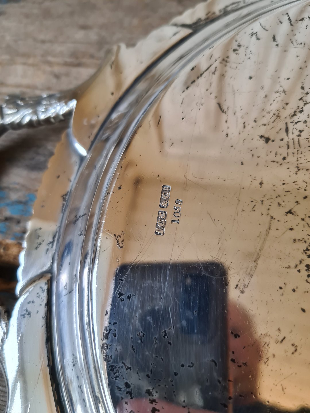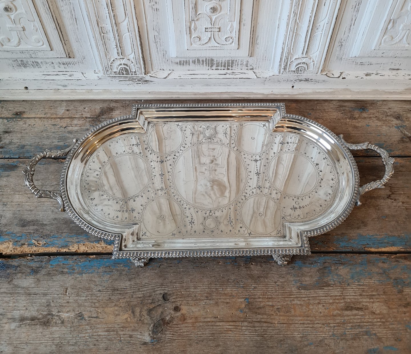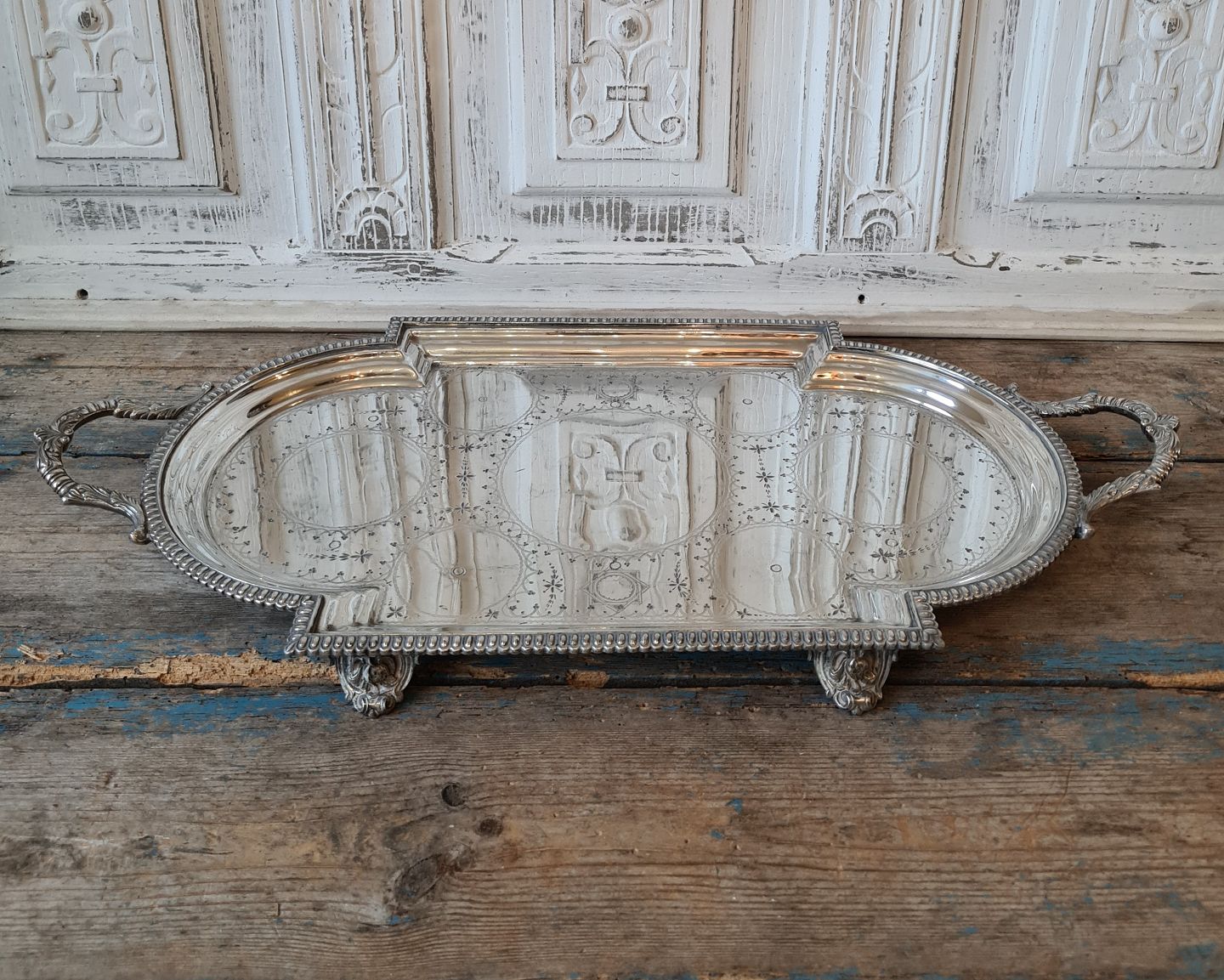 Stor forsølvet bakke med hanke, bakken står på fire ben.