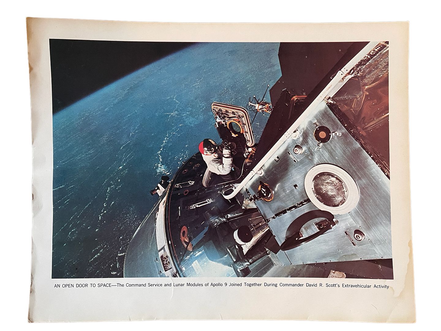 Originalt NASA farveoffsetfotografi fra Apollo 9-missionen i marts 1969, der var en forberedelse til månelandingen i juli samme år og foregik i lavt kredsløb om jorden. På billedet ses astronauten David R. Scott i Gumdrops åbne luge under en såkaldt EVA.