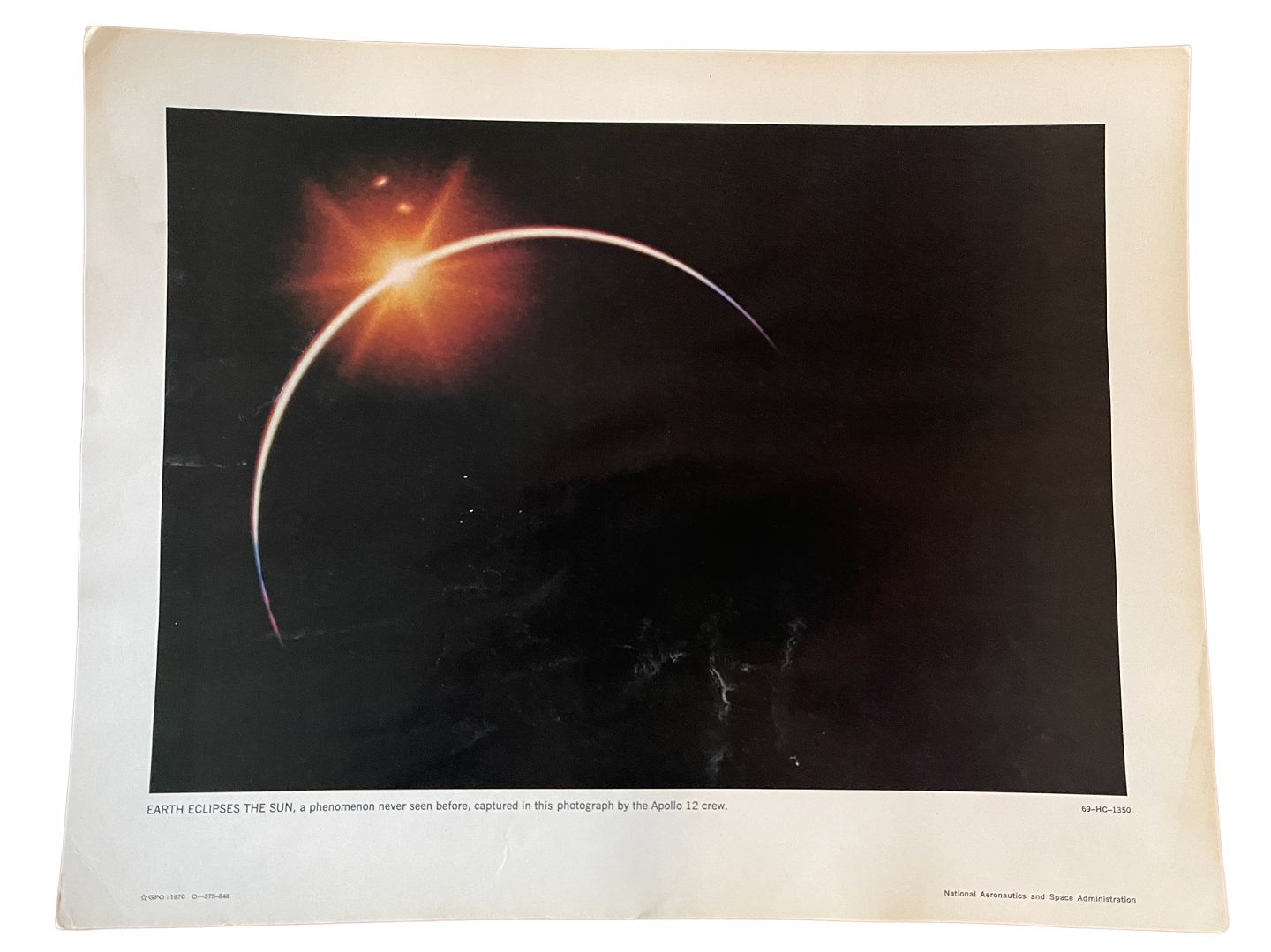 Da Jorden bevægede sig direkte mellem solen og Apollo 12-rumfartøjet på rejsen hjem fra månen, fangede besætningen dette billede af en solformørkelse med et 16 mm filmkamera. Ombord på fartøjet var astronauterne Charles "Pete" Conrad, Richard F. Gordon Jr. samt Alan Bean. Mens Conrad og Bean landede på månen i landingsmodulet "Intrepid", forblev Gordon i kredsløb om månen i kommandomodulet "Yankee Clipper".