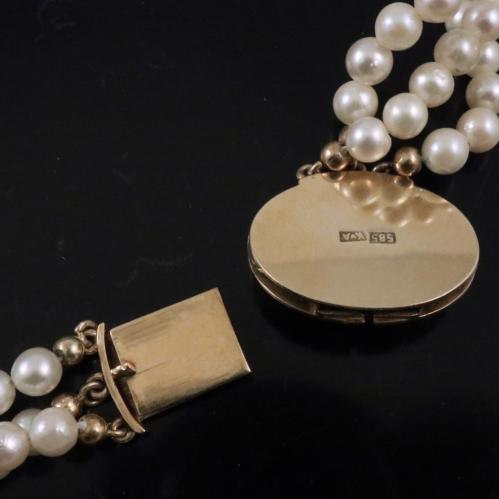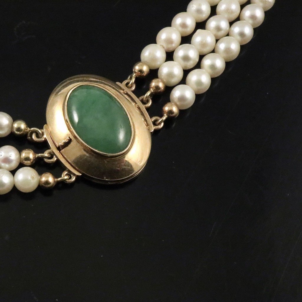 Knud V. Andersen. Tre-radet perlekæde med lås i 14k guld med jade.