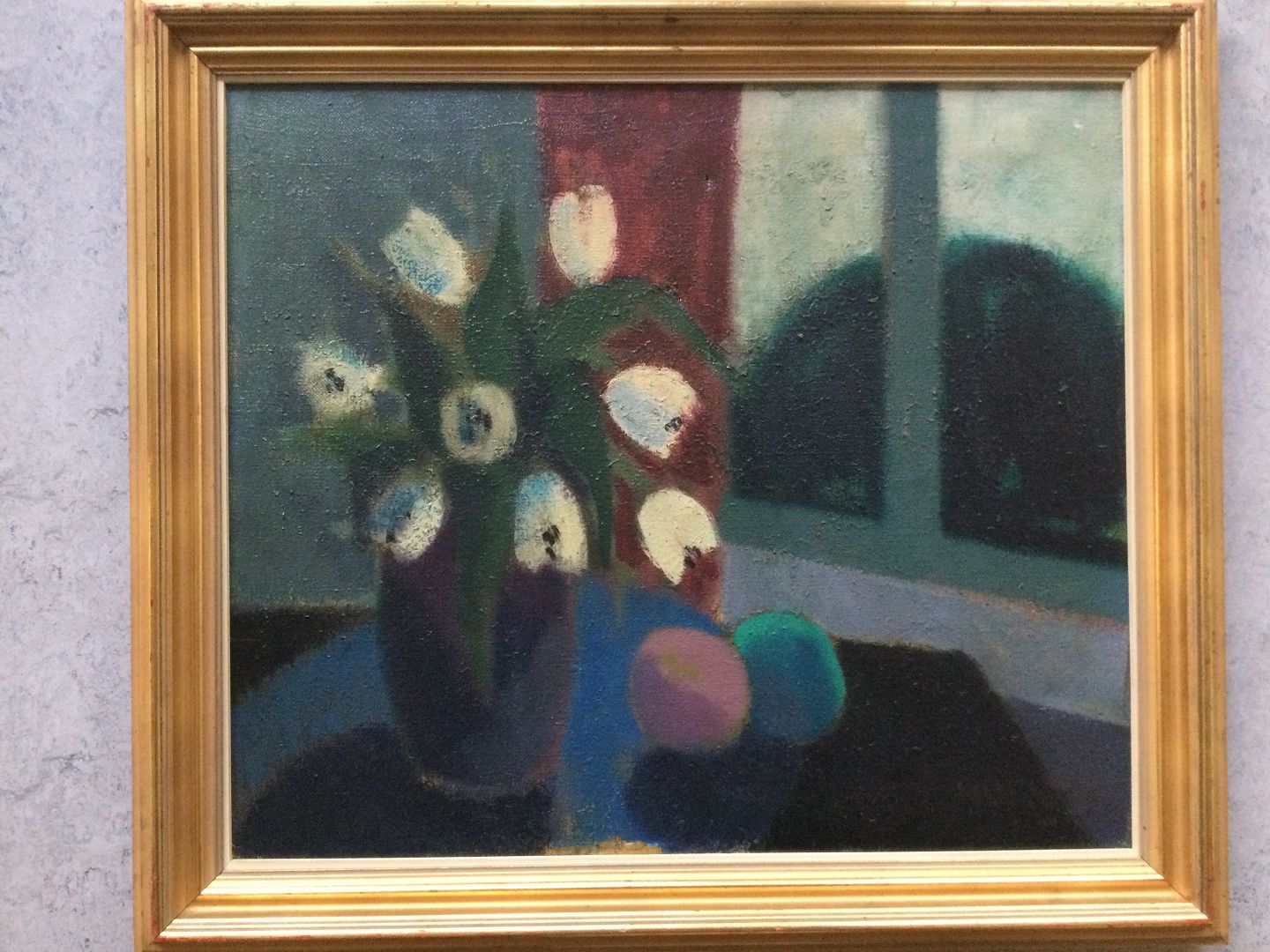 Maleri af Knud Horup - Opstilling med hvide tulipaner og frugter i vindueskarm.