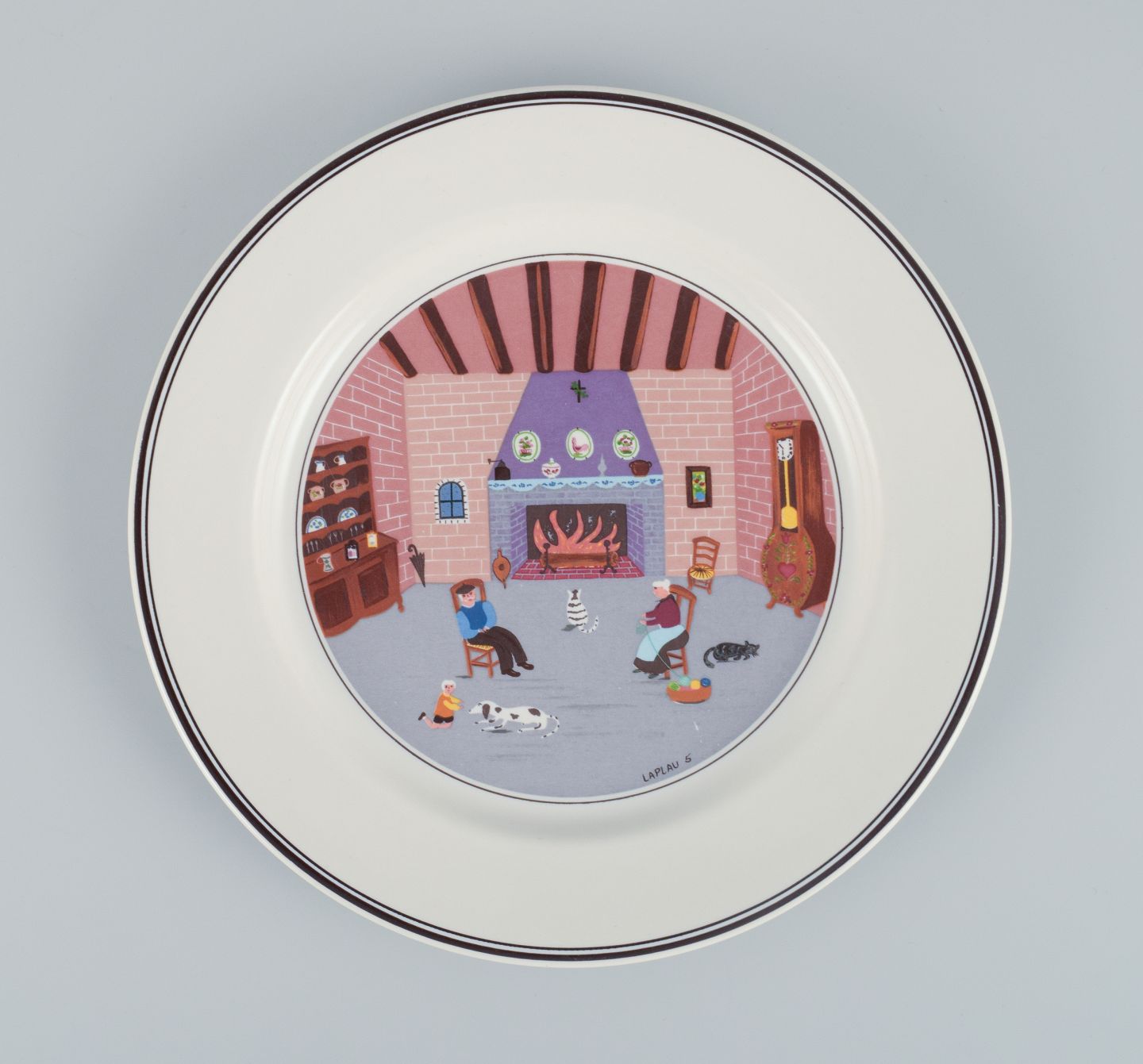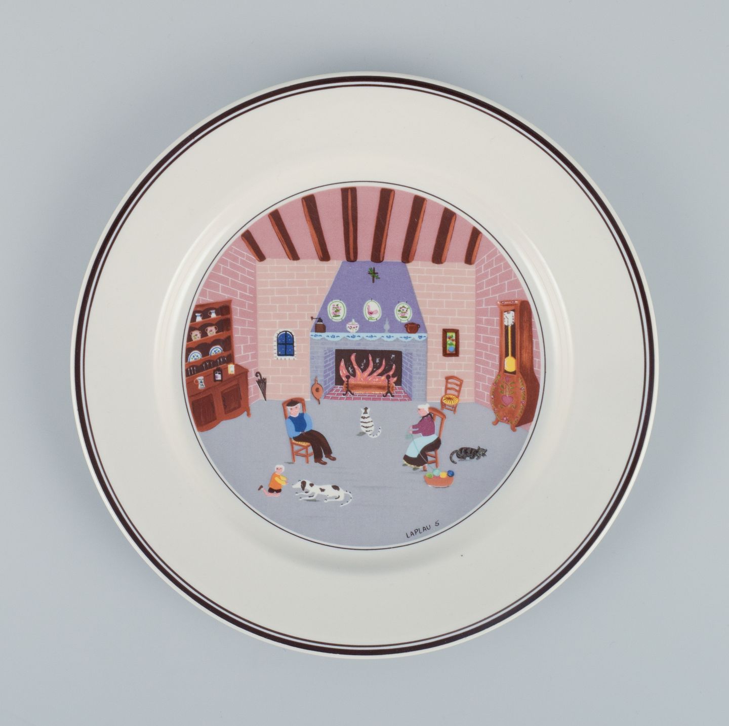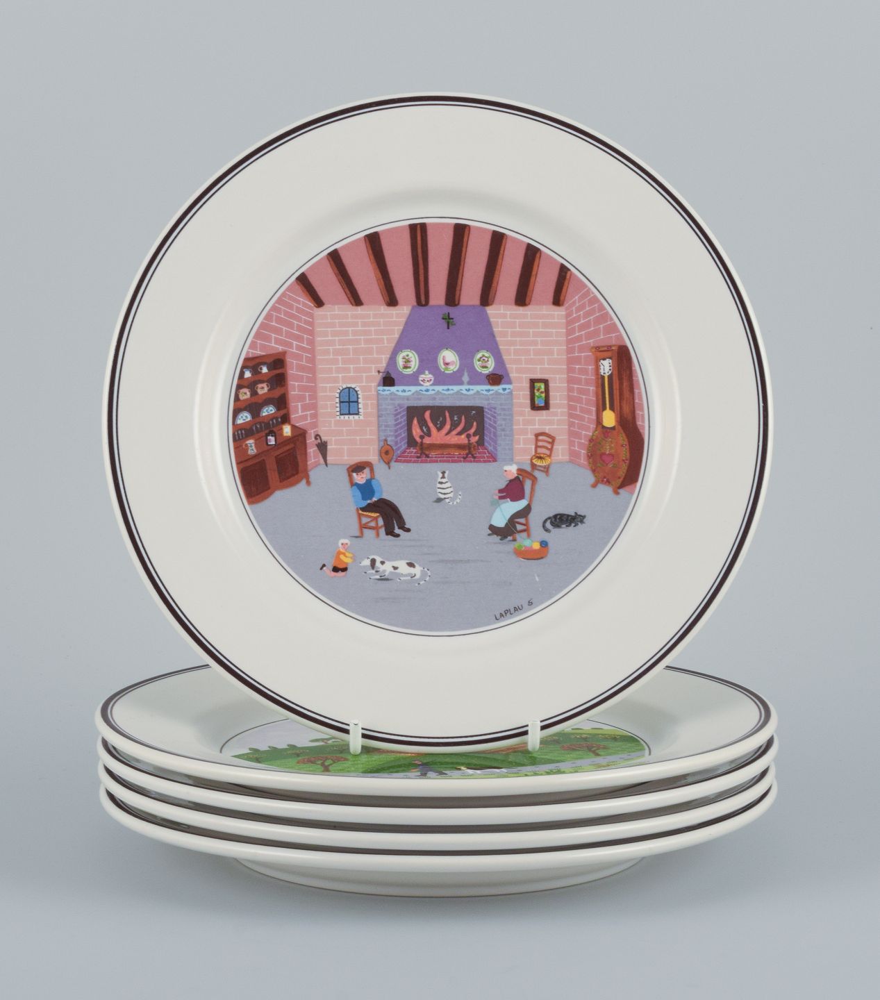 Et sæt på fem ”Naif” tallerkner i porcelæn med motiver af familier, landsbyer og bibelske scener i naivistisk stil.
