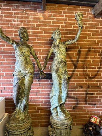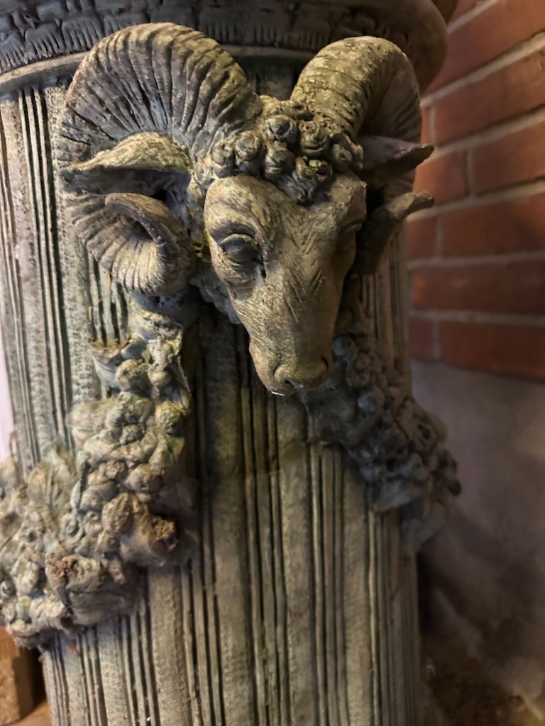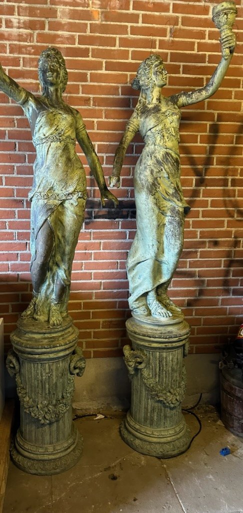 Pair of Late Empire bronze lamps. Roman style anno 1900 first half of the century. Base flanked with floral tendrils and buck heads. Early provenance: Vinderslevholm castle is a manor house whose history goes back to the 15th century according to Seller. Height: 230 cm Width 60 cm. lamp glads for torch in the hand is missing. contact for viewing
