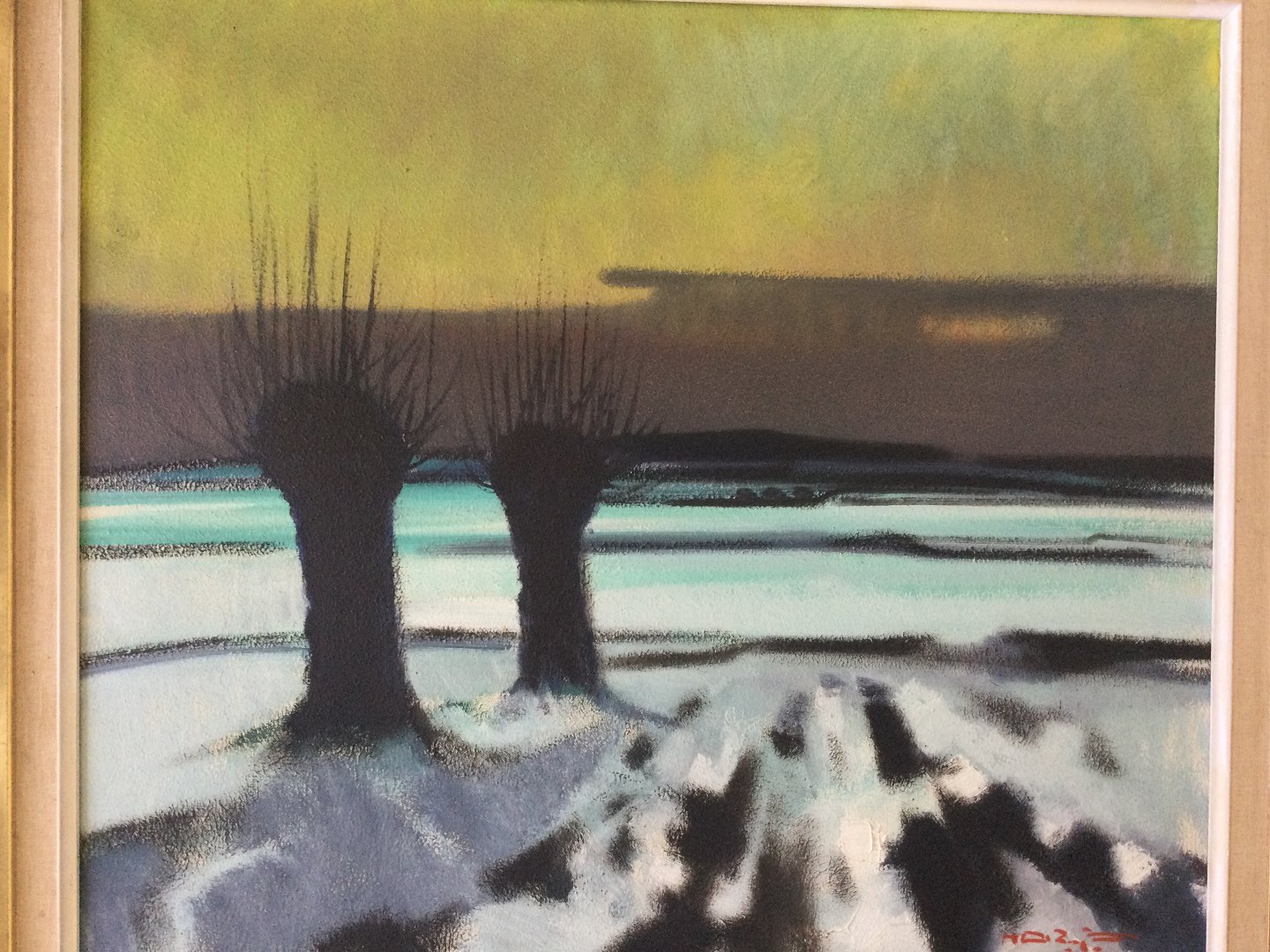 Maleri af Knud Horup - Vinterparti med vej og stynede træer.