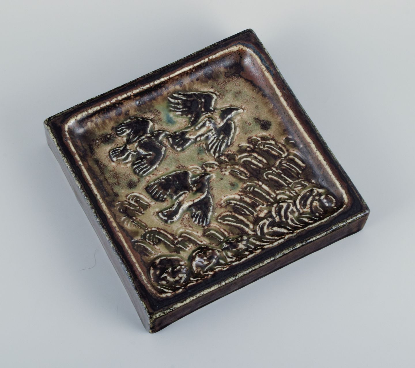 Vægrelief i stentøj med motiv af fugle i landskab.