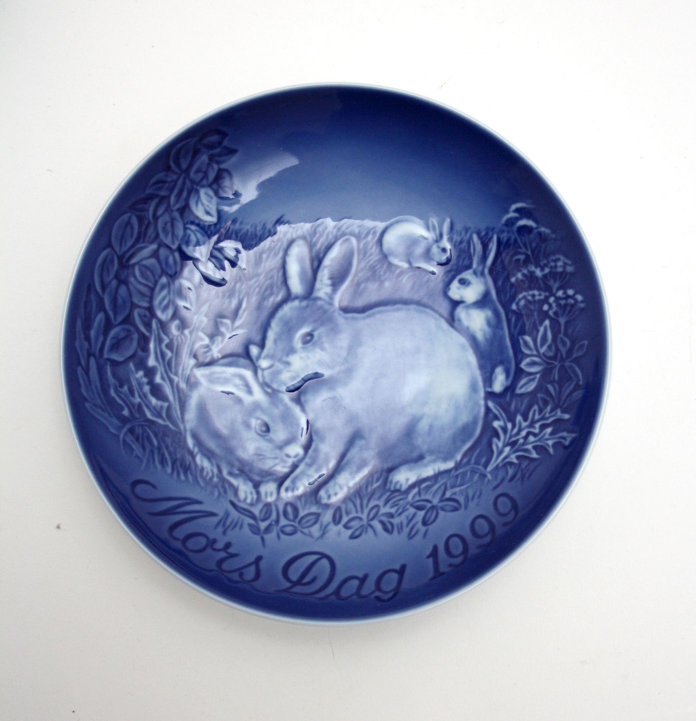 Bing & Grøndahl, Mors dag platte 1999. Kanin med unger. Diameter 15 cm. Pris: 200 kr. stk. Lager: 1