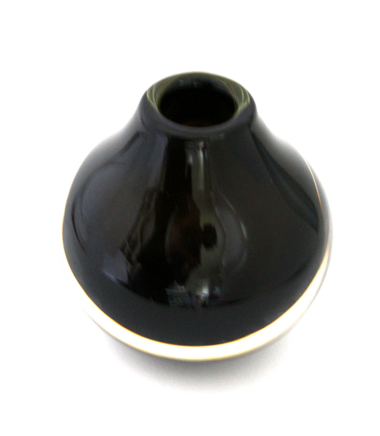 Vase i mørk flaskegrøn glas med klar overfang. Designet af Olle Brozén, som har været tilknyttet Kosta Boda i en årrække. Indgraveret i bund "Prov of". Højde 10,5 cm. Største diameter ca. 10 cm. Pris: 250 kr.