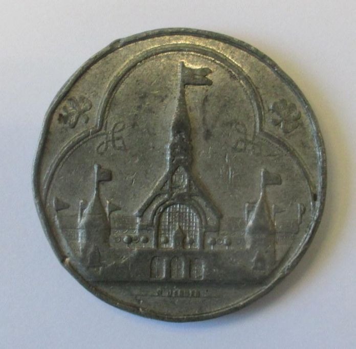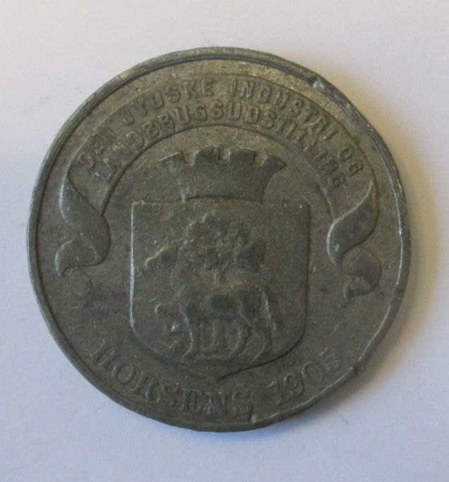 Medalje fra Den jyske Industri og Landbrugsudstilling, Horsens, 1905. Danmark. Medalje i aluminimum. Dia.: 4,5 cm.