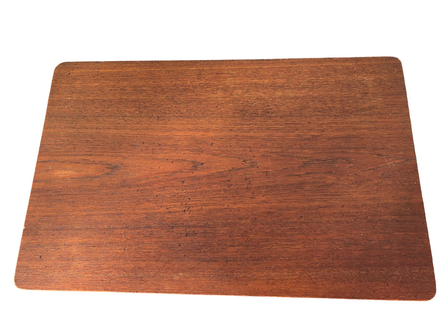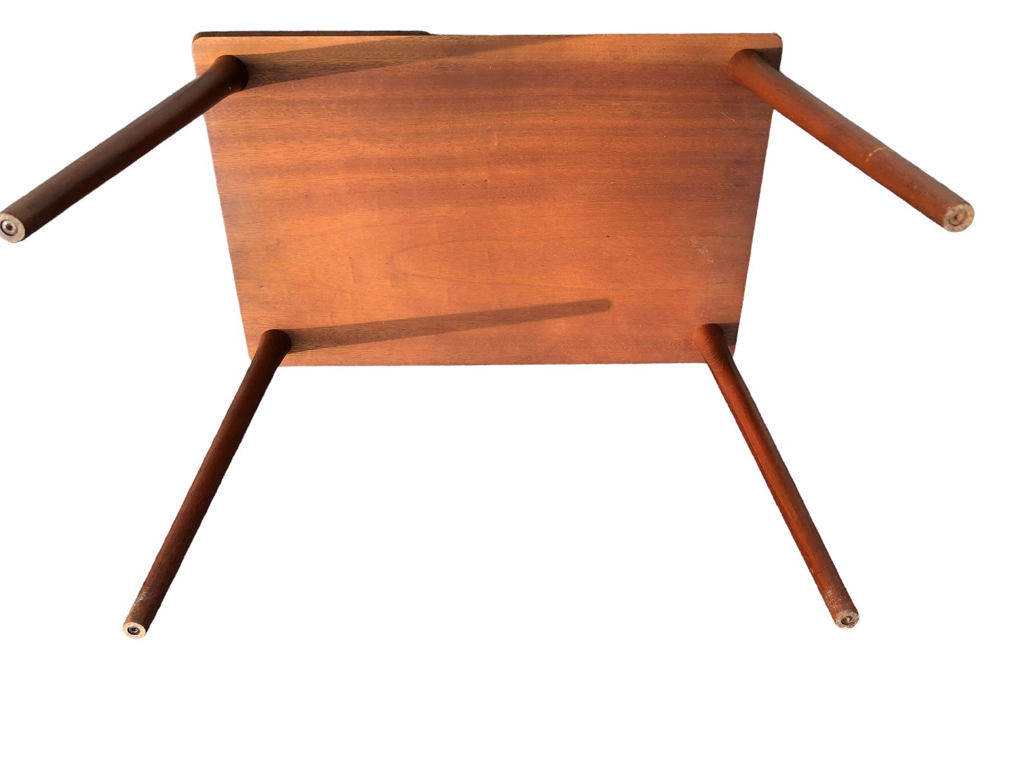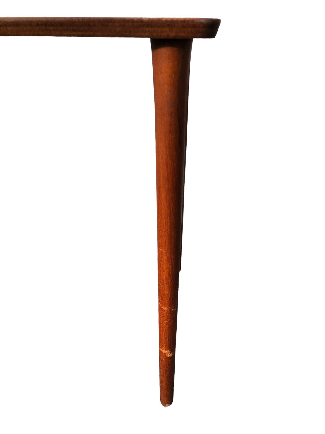 Small table in teak veneer with slightly conical legs in solid teak wood. Danish modern from the 1960s, appears with shower tracks. Dimensions: 46x60x38