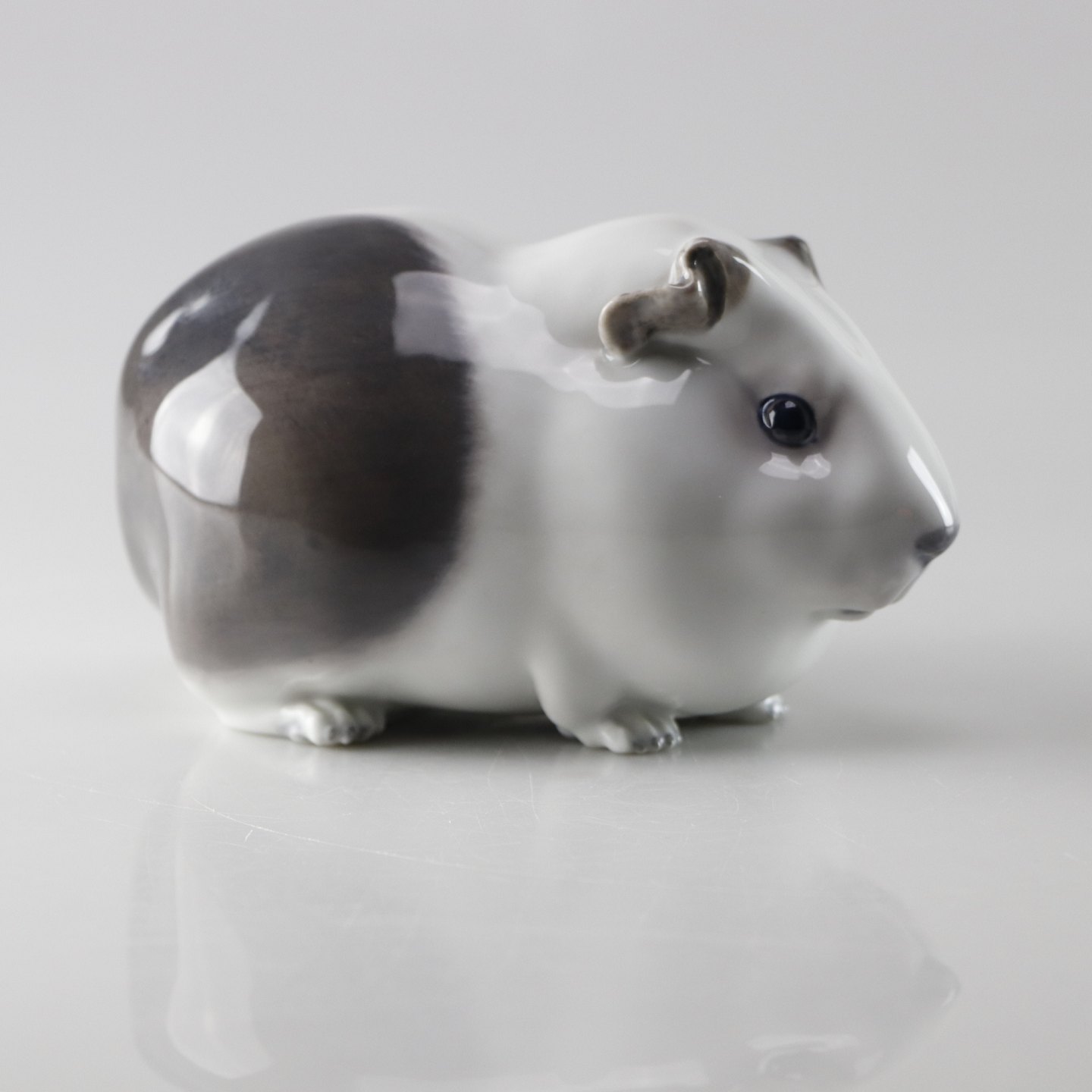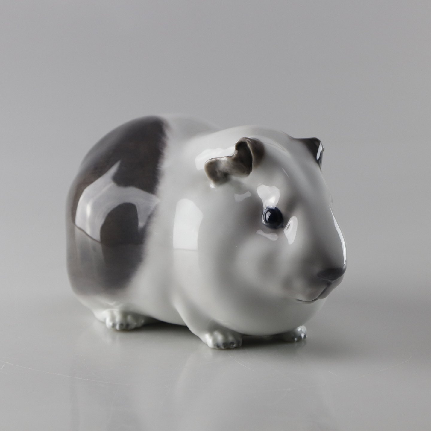 Figur af porcelæn i grå og hvide farver af et marsvin