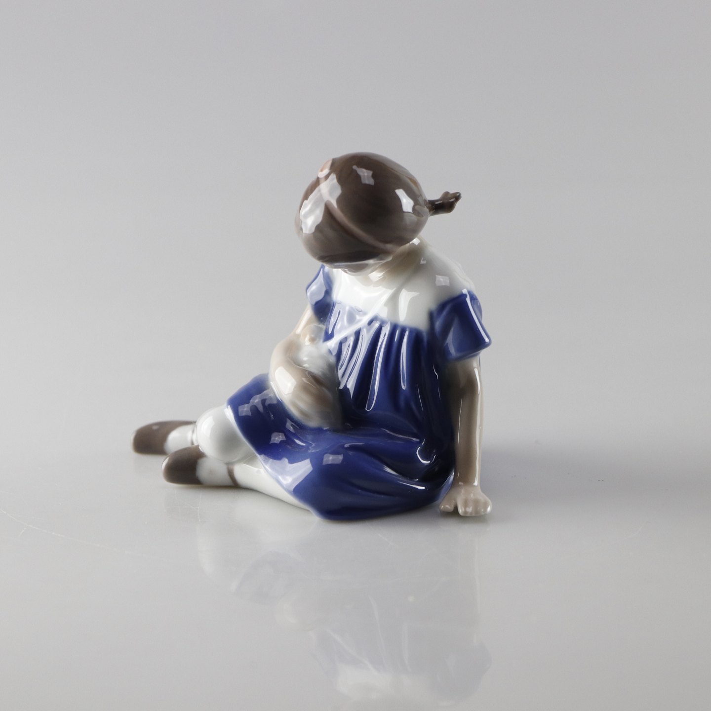 Figur i porcelæn af en pige med en dukke i armen