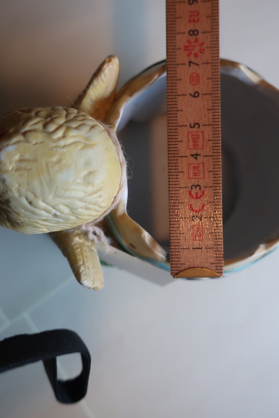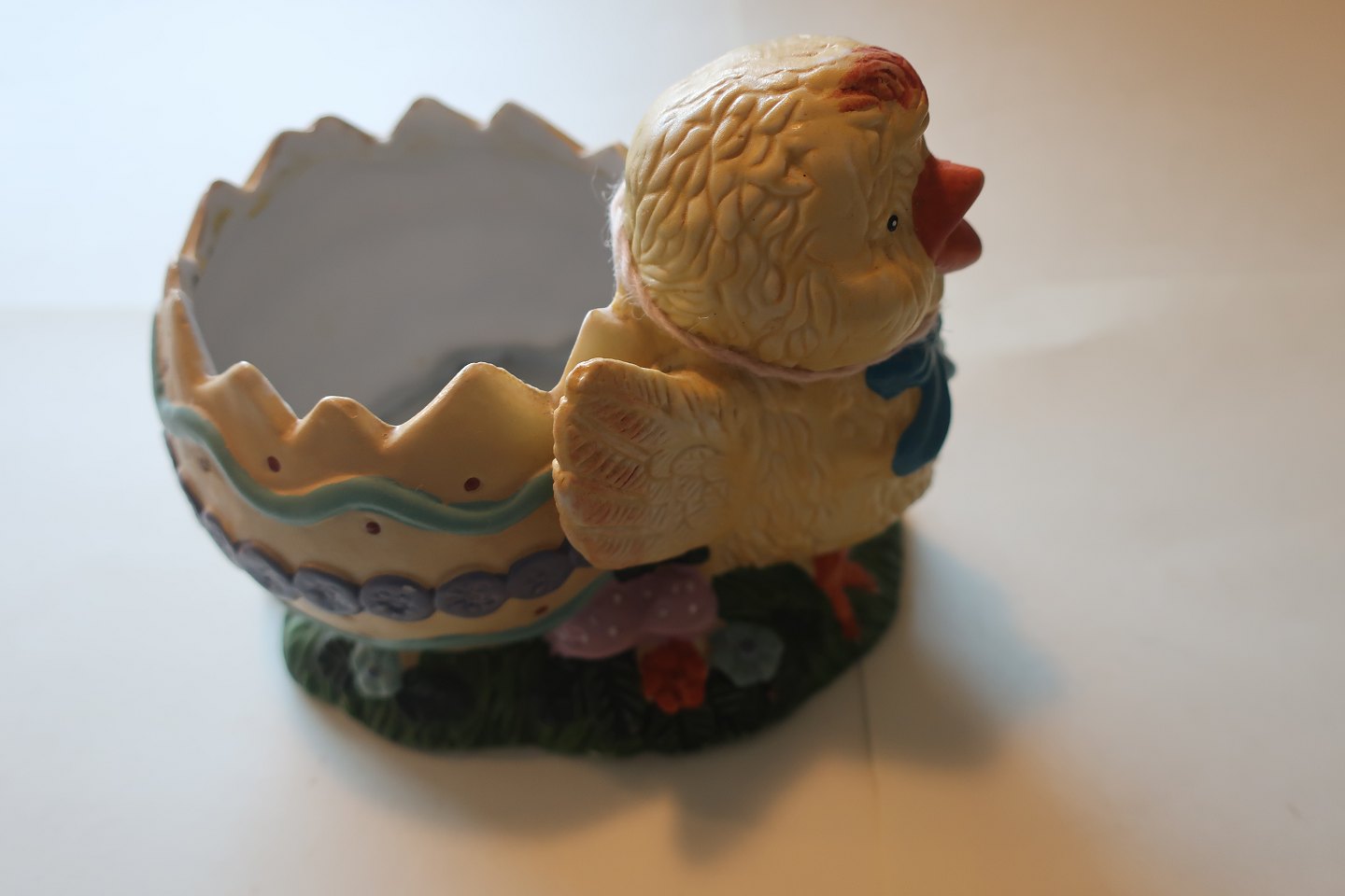 Gammel bisquitfigur (biskvitfigur) som kylling med æg