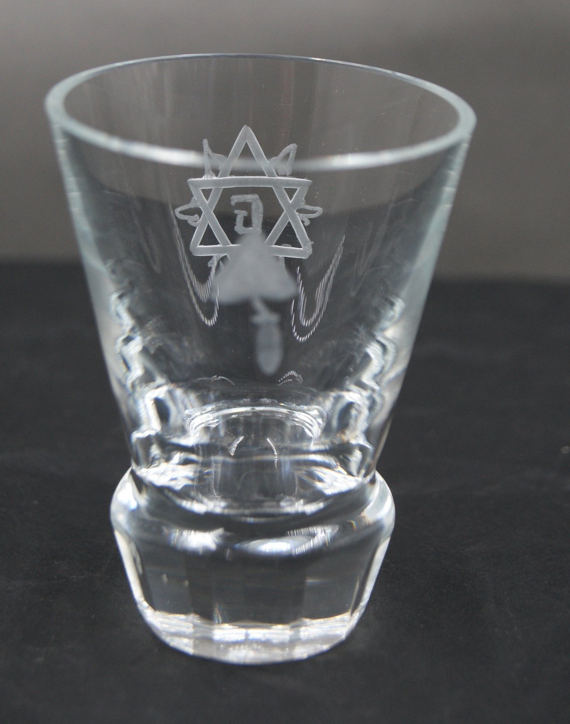 Frimurer glas eller Loge glas, snapseglas dekoreret med slebne symboler, på kantsleben fod.