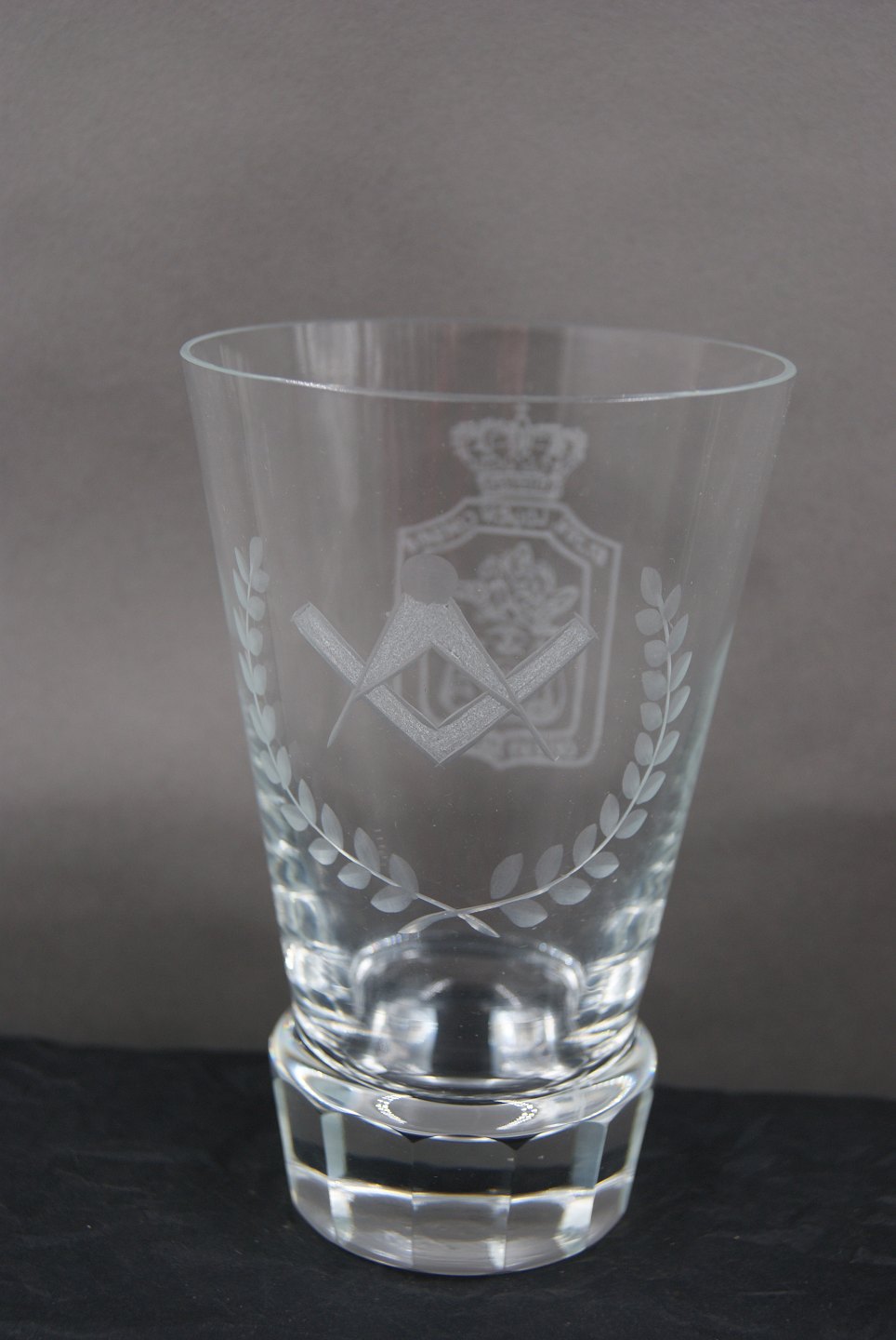 Frimurer glas eller Loge glas, Ølglas dekoreret med slebne symboler, på kantsleben fod til Sankt Johannes Logen Cimbria i Aalborg.
