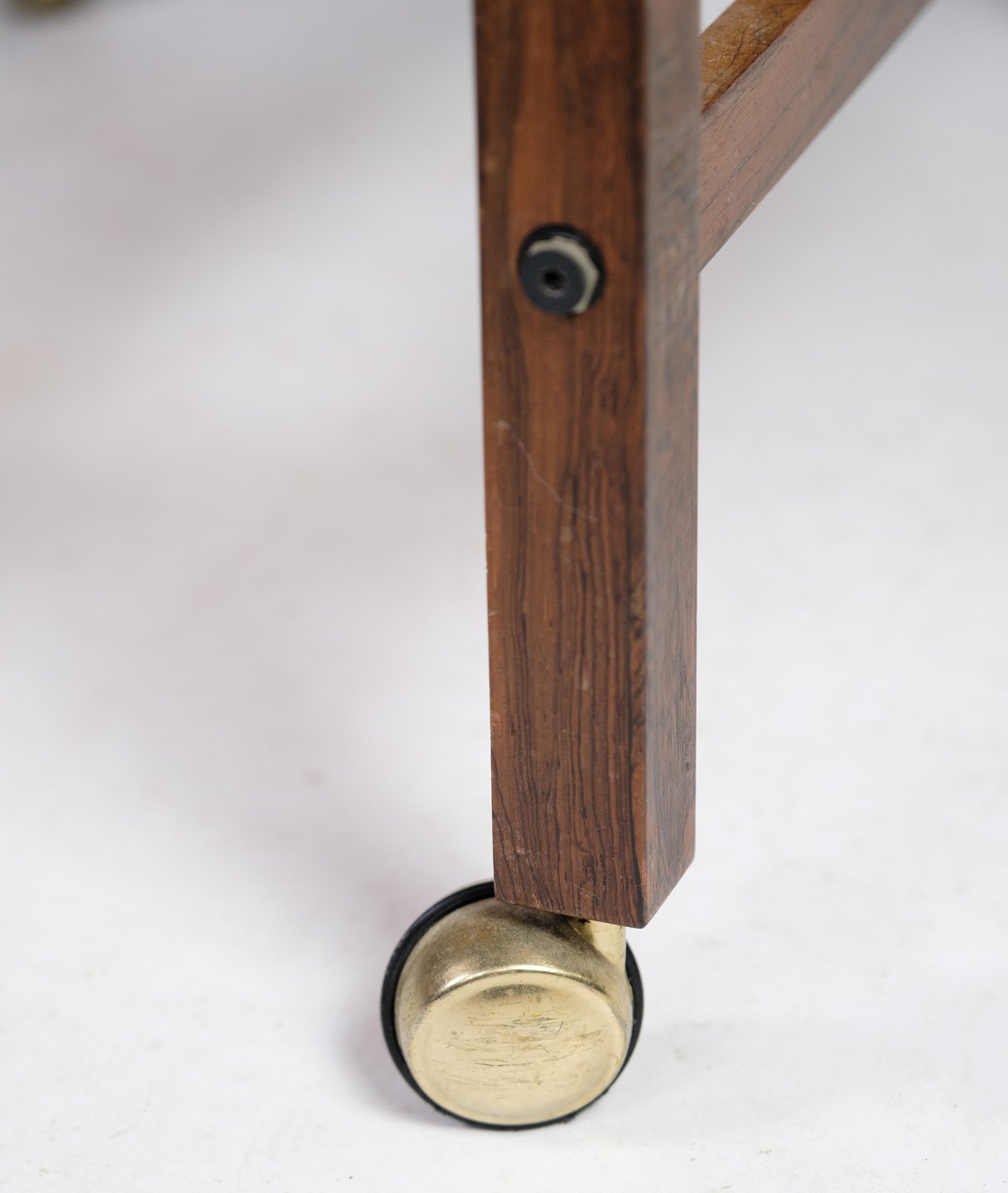 This vintage sewing table / bar table on rosewood legs is a fantastic example of Danish furniture design from the 1960s. It is manufactured in Denmark and is of exceptional quality with a fantastic design.