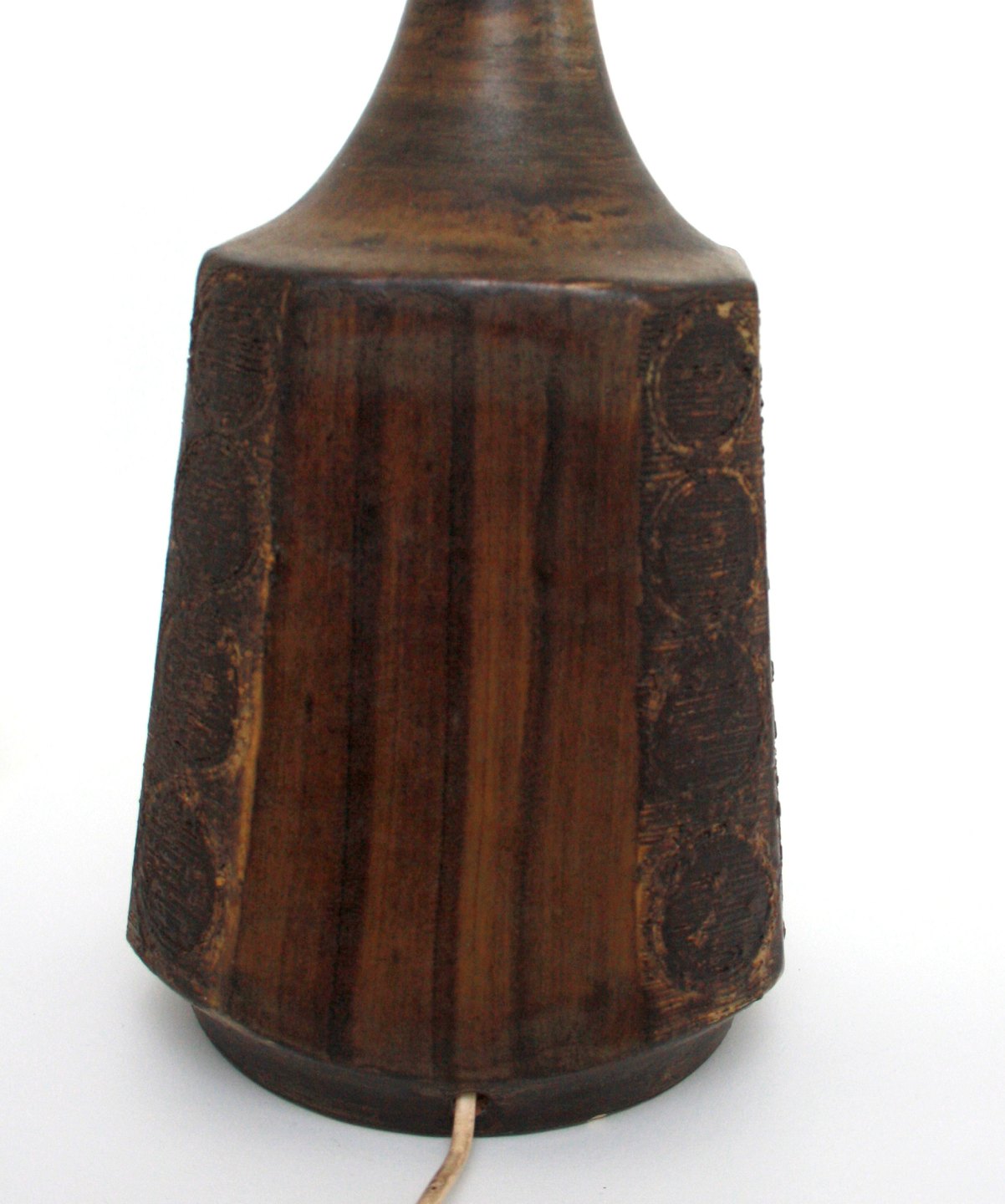 Bjørn Keramik, Bordlampe i brun glasur med blomst motiver. Højde excl. fatning 42 cm. Diameter bund 19,5 cm. Glasurafslag i bund se ekstra foto. Pris: 550 kr.