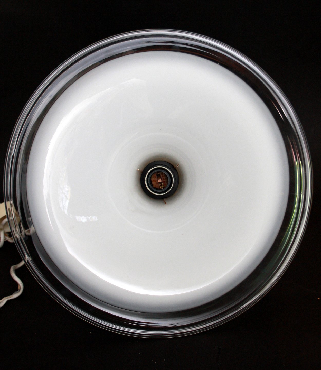 Holmegaard, Etude lampe i opalinehvid glas med klart omfang. Designet af Michael Bang i 1978. Højde 29,5 cm. Diameter 37-39 cm. Pris: 800 kr. stk. Lager: 3