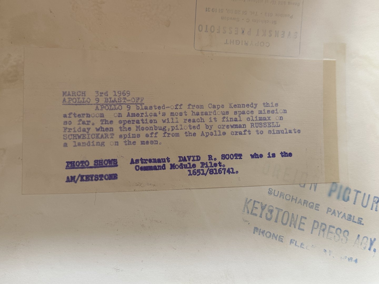 In addition to a stamp from the Keystone Press Agency, there is a copyright stamp from Svenskt Pressfoto in Stockholm.
