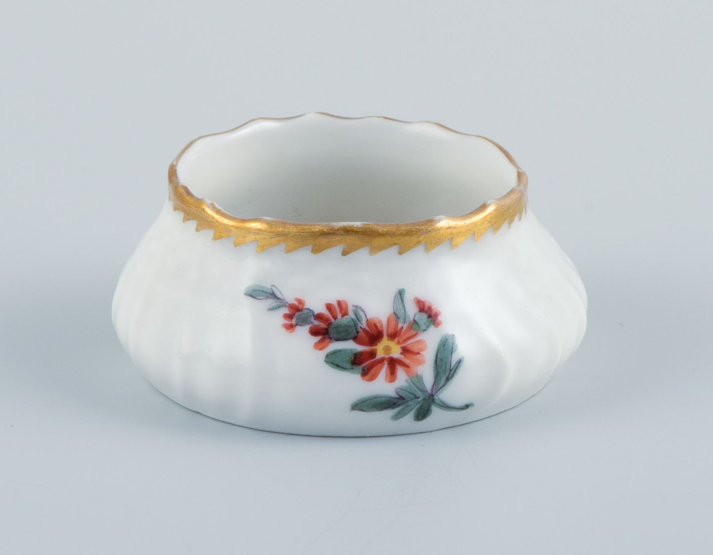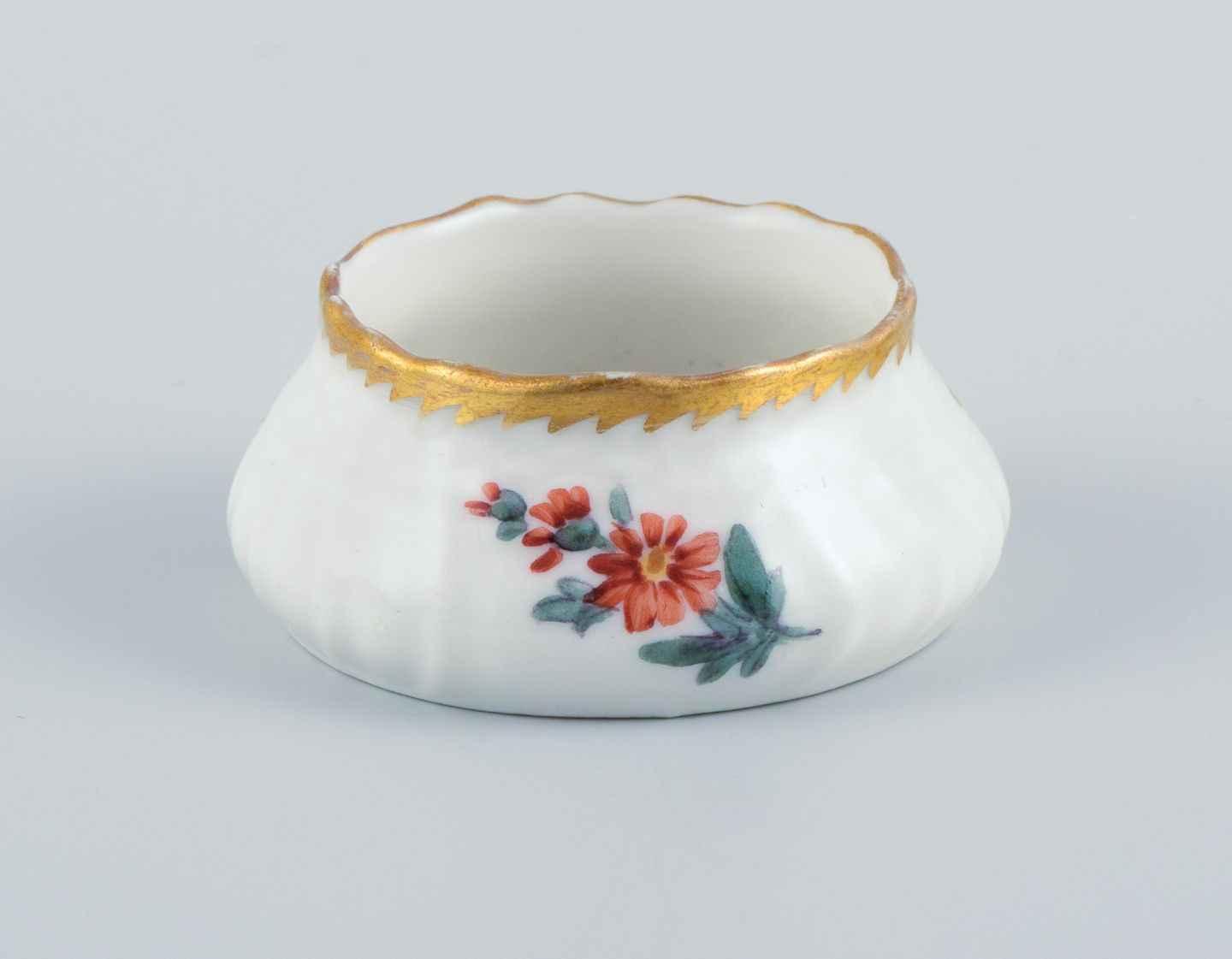 Et sæt på fem saltkar, håndmalet med blomster og takket guldkant.
