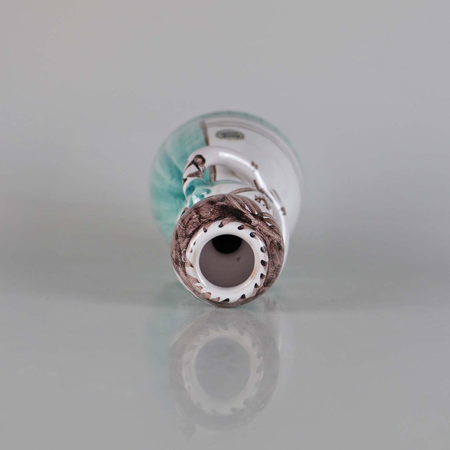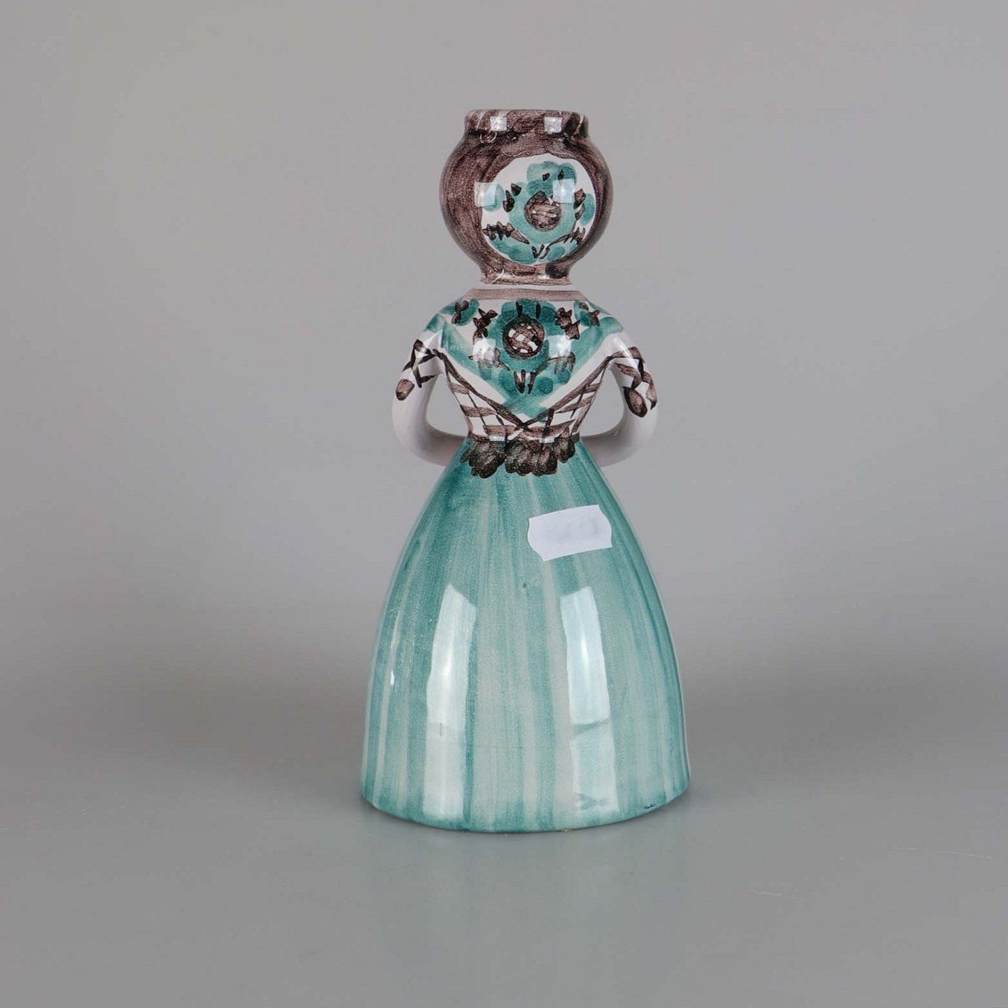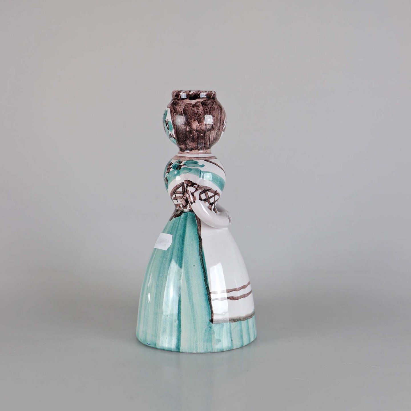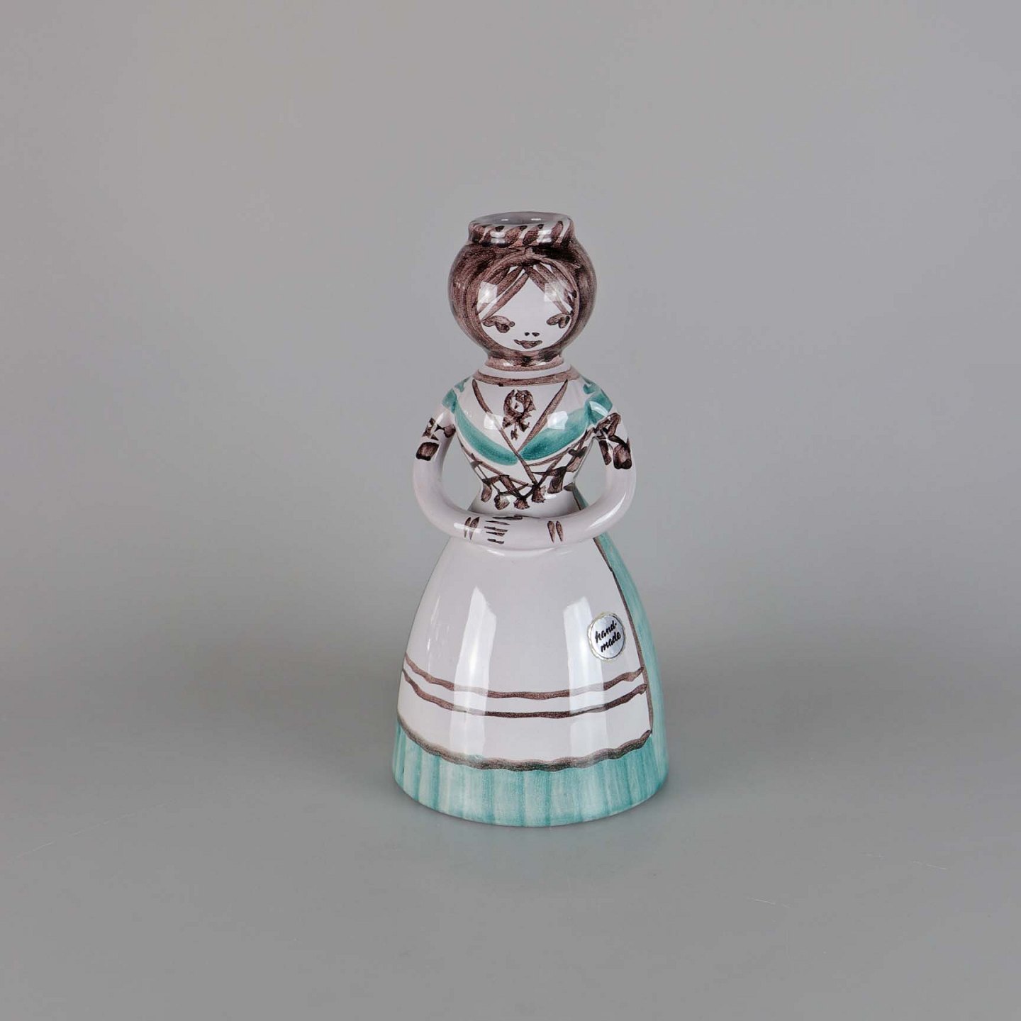 Stage af kvinde med kjole i grøn, hvid og brune farver