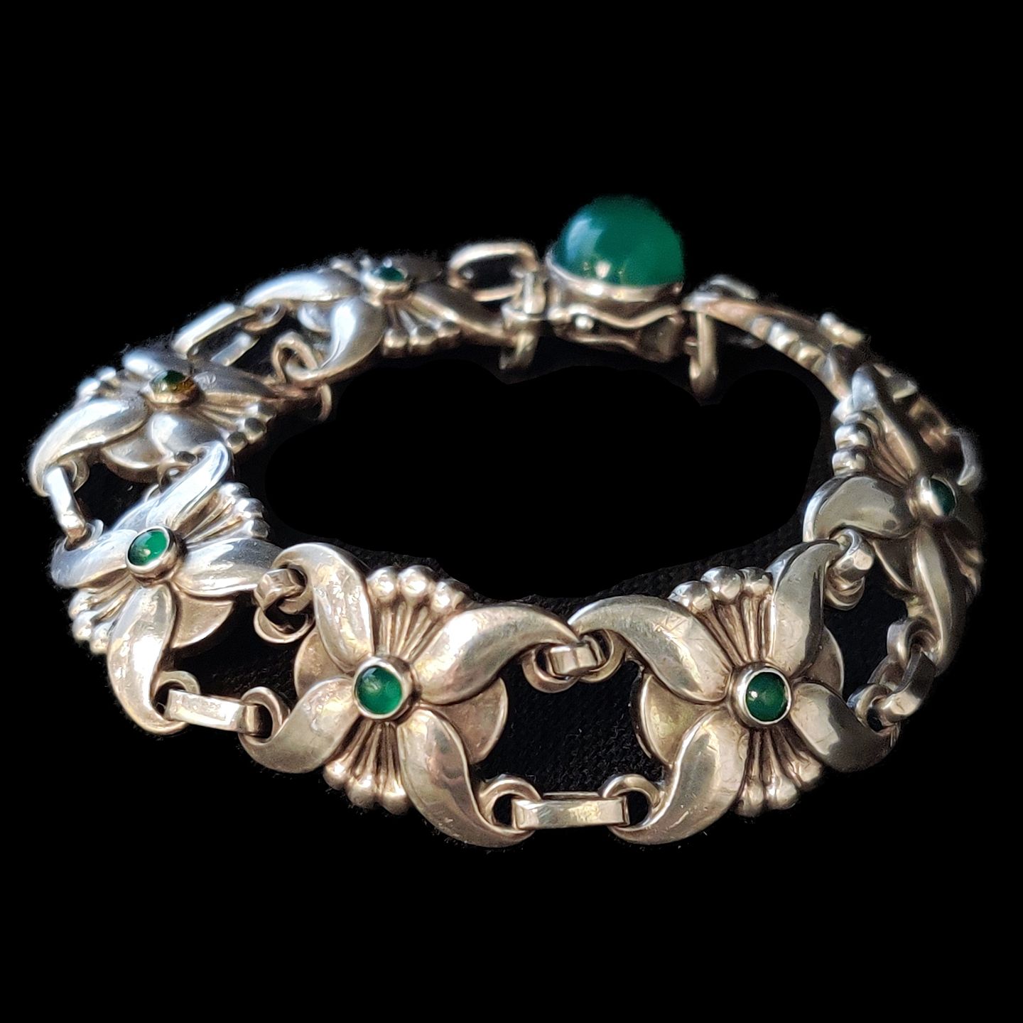 Georg Jensen; Armbånd i sterling sølv prydet med grønne chrysopraser #37. Monteret med kasselås samt én sikkerhedslås.