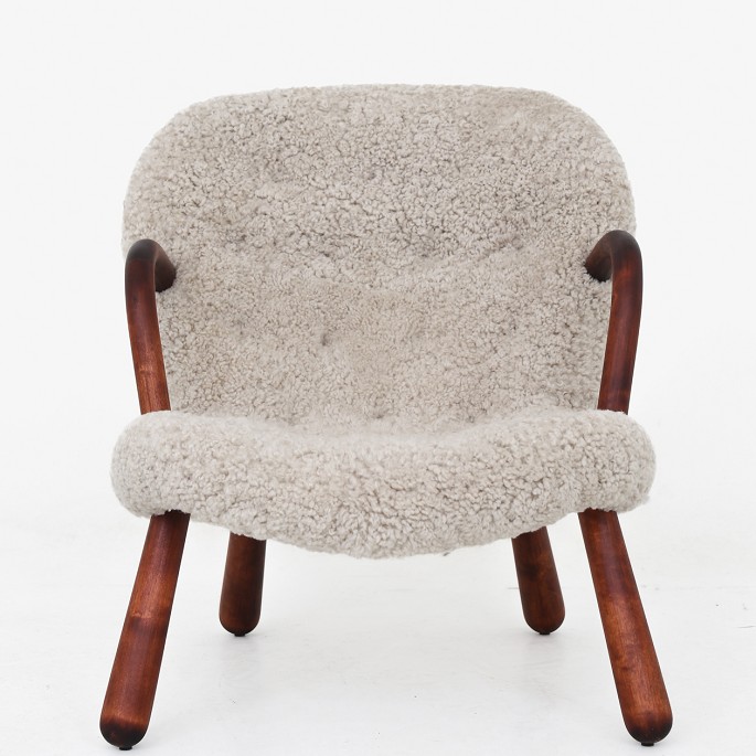 Tidlig, original Muslingestol (Clam Chair) i nyt lammeskind (Moonlight) med bejdset stel af bøg.