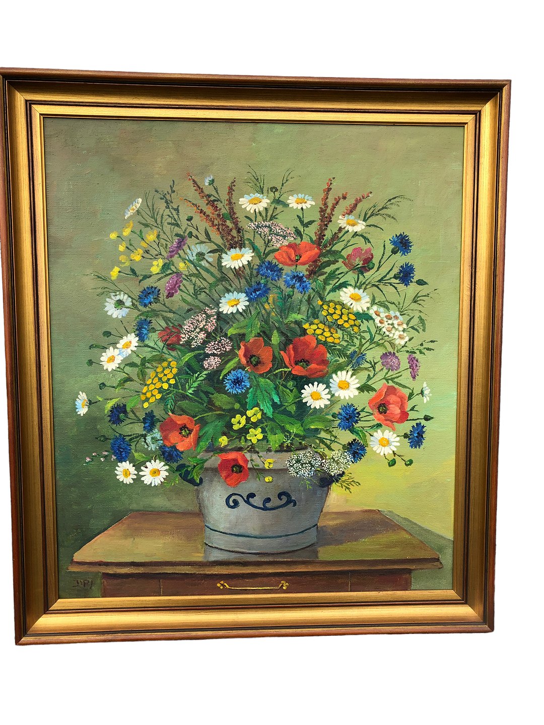 Blomster maleri. Oliemaleri på lærred. Signeret DPL. Mål med ramme:64x73 cm