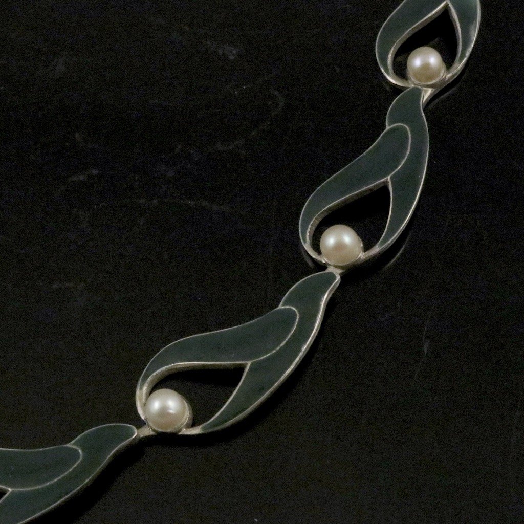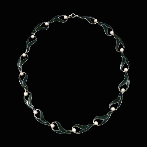 A. Michelsen. Halskæde i sterlingsølv med grøn emalje og perler.