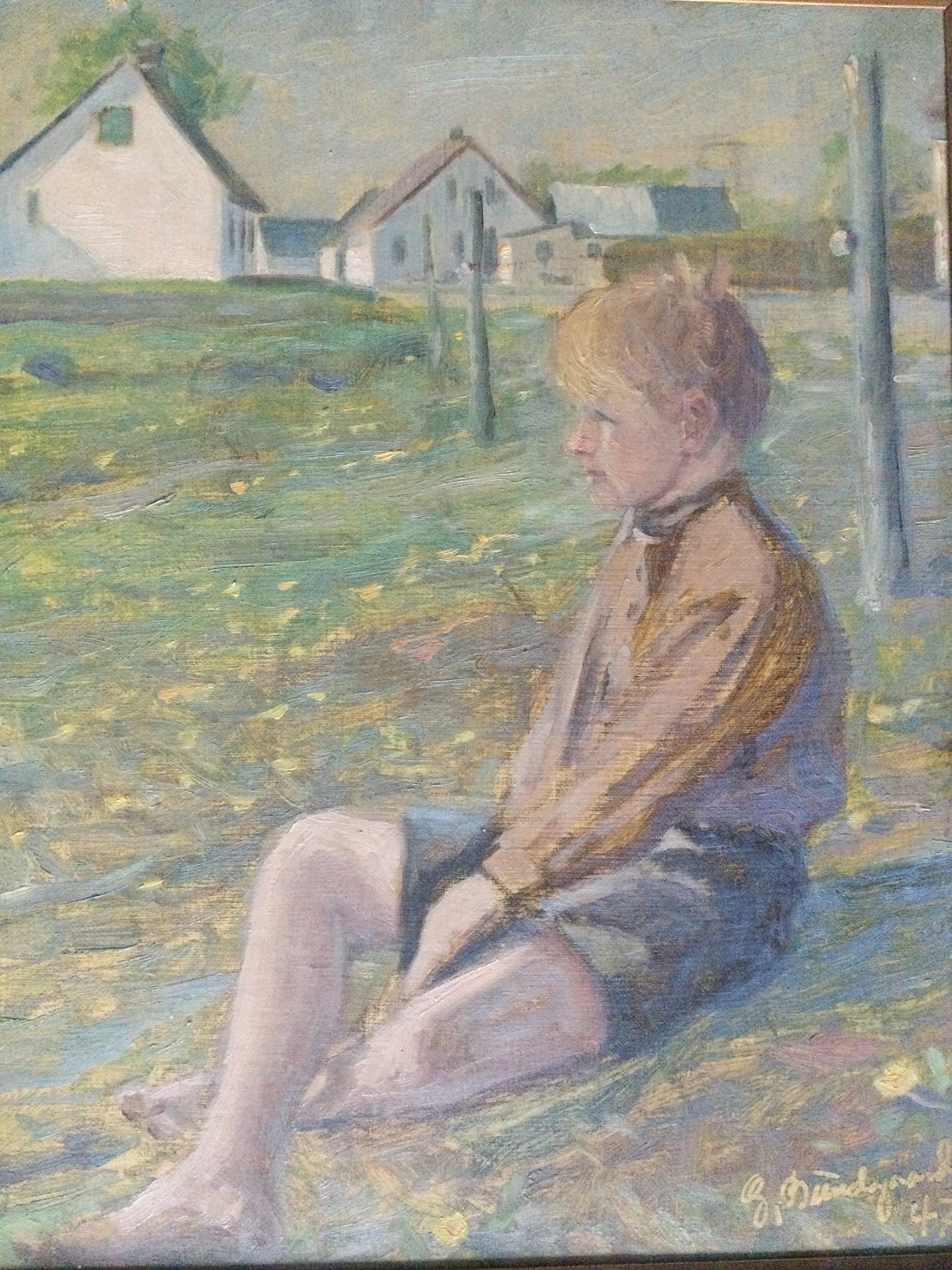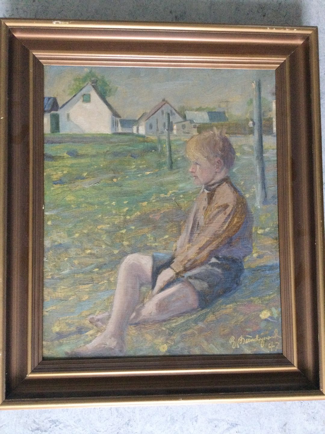 Maleri af Gunner Bundgaard - Siddende dreng i landskab ved gård 1947.