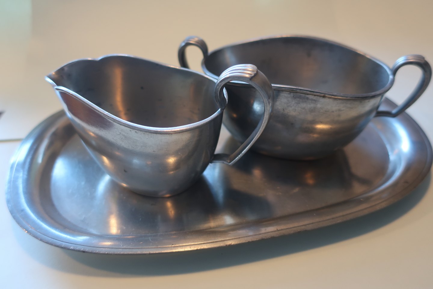 Set made of pewter with tray + sugarbowl + a little jug