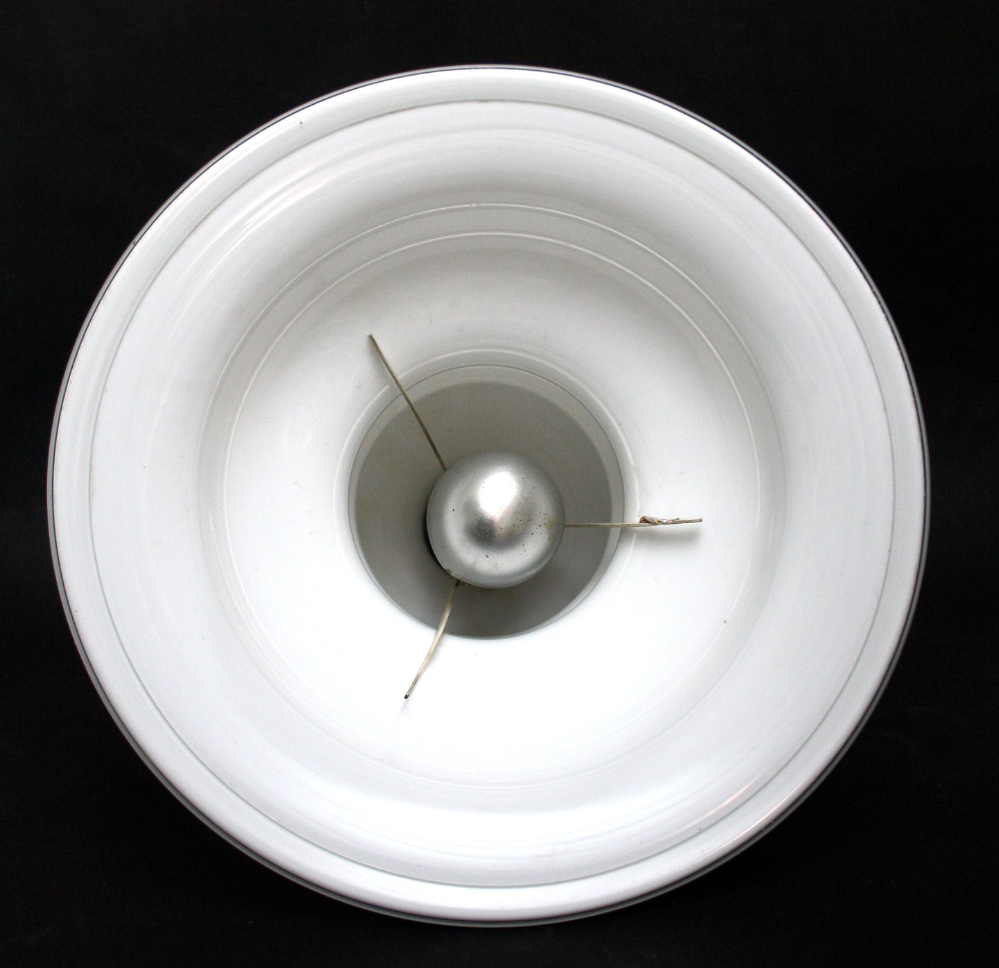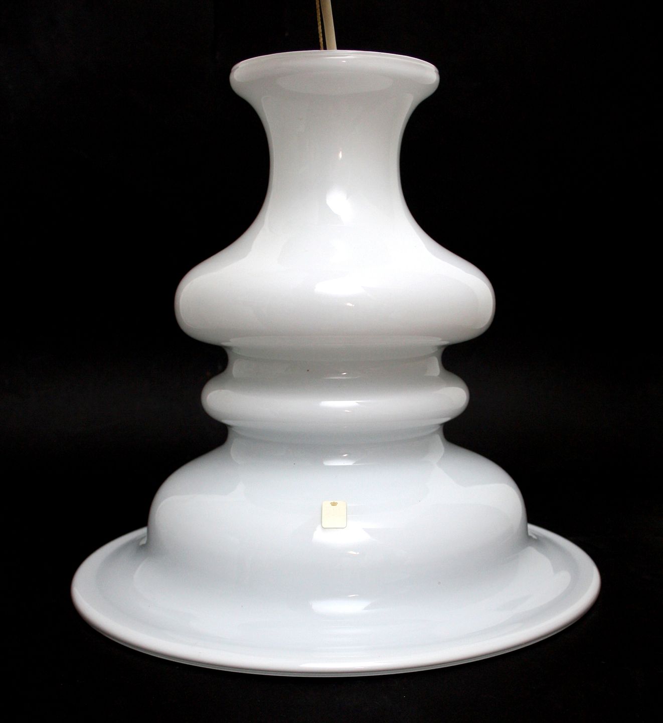 Text available in Danish: Holmegaard, Stor Bibliotek pendel i opal hvid glas. Designet af Sidse Werner i 1981. Højde 31,5-32 cm. Nederste diameter 33-33,5 cm. Fin stand. Pris: 975 kr. stk. Lager: 2