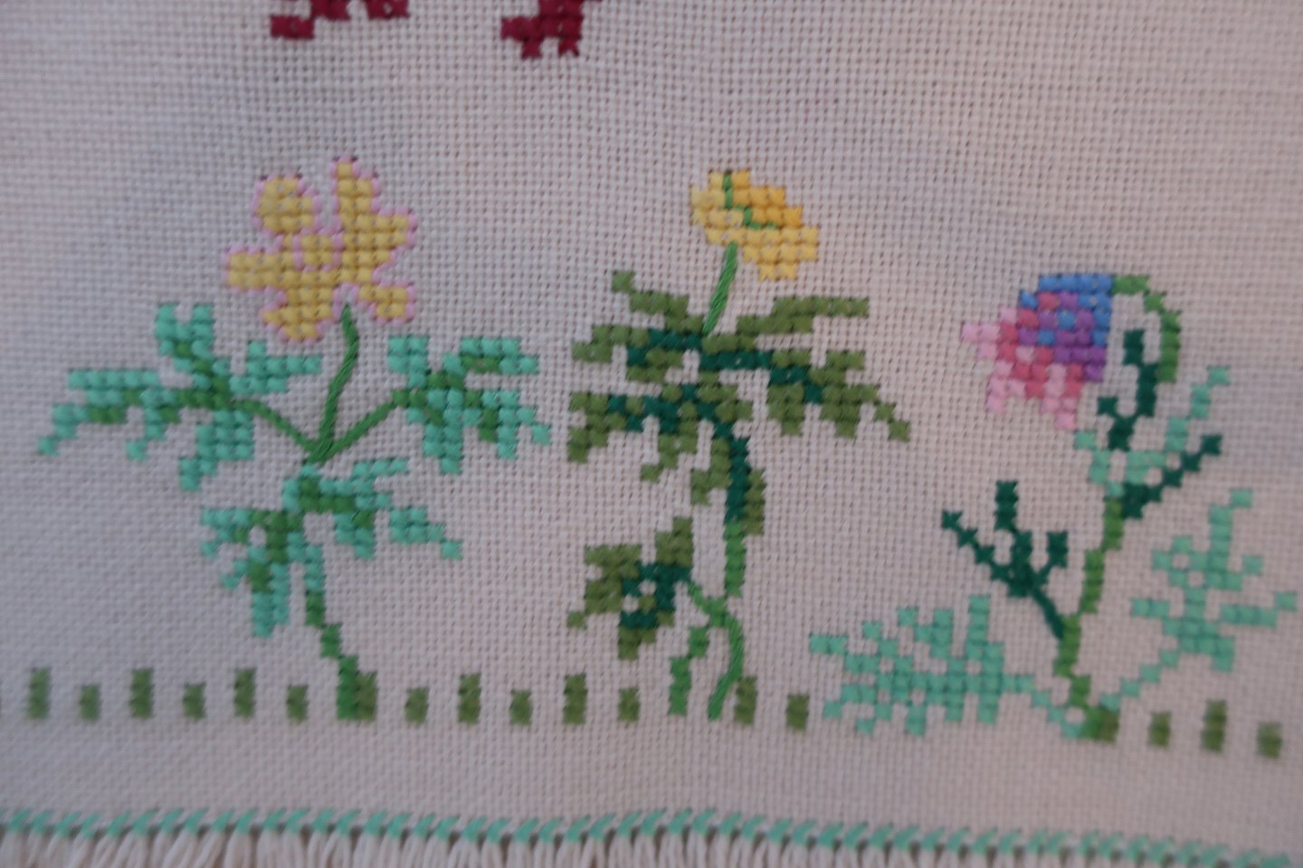 Håndbroderet i korssting med glade kyllinger